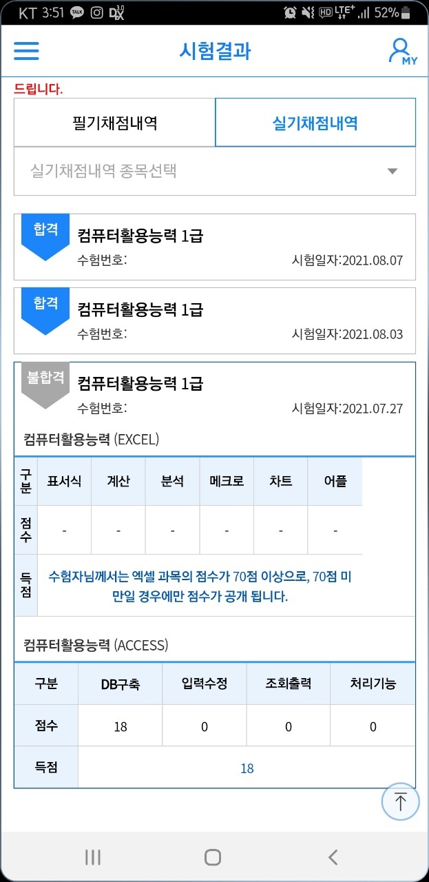 두번째 시험은 가채점이 75점이었고 세번째 시험은 74점... 다들 간당간당 한 것 같으면 시험을 더 치는 것을 추천한다고 했지만 너무 질려서 더이상 보고 싶지 않았어요. 그냥 결과 나오고 떨어지면 시험 보려고 결과 발표 5일 후에 시험 2개 잡아놓고 기다렸습니다. 공백 2주동안은 하루에 한 개라도 상설 문제들을 풀면서 잊어버리지만 않을 정도로 공부했어요