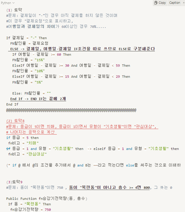 노트북으로 필기하는게 수기로 쓰면서 공부하는 것보다 머릿속에 덜 남는다는 단점이 있지만, 컴활에서 요구하는건 암기가 아니라 문제를 얼마나 빠르고,정확하게 푸는거라고 생각했기에 강의를 들으면서 메모장으로 부족한 부분을 짚고, 아이패드로 교재를 보면서 복습하고 틀린 파트는 아래처럼 토글로 달고 코드로 정리하면서 어떤 부분을 고치면 좋을지 많이 생각했어요