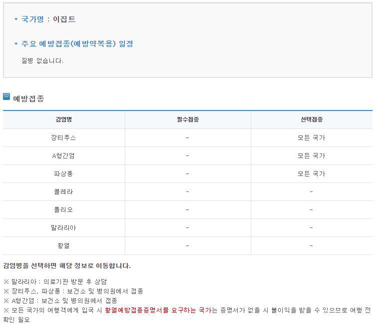 이집트로 여행 또는 사업차 방문하면서 예방접종을 하는경우는 없으니 안심하셔도 됩니다.