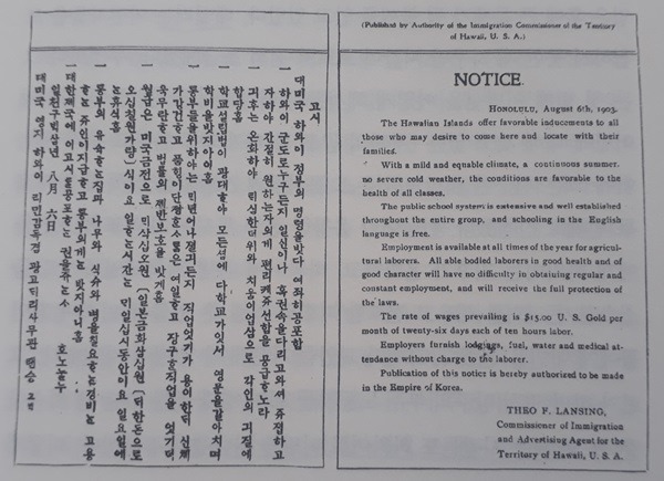 | 첫째, 하와이 제도 각 섬에는 누구를 막론하고 독신이나 직계 가족을 동반해 주거를 원하는 사람은 편리하게 주선하노라. 둘째, 기후조건은 적당히 온화하여 심한 추위나 더위가 없으므로 개인의 기질에 알맞고 쉬이 적응되리라 믿는다. 셋째, 학교설립이 방대다면하여 모든 섬마다 학교가 이미 설립되었고 영문으로 학생을 교수하며 학비는 일체 없다. 넷째, 농부들은 그들을 위해 해마다 절기에 따라 직업을 얻기 쉬운데다가 다만 육체가 건강하고 품행이 방정한 사람이면 장기간의 직장을 구하기 쉬우며 하와이 법률의 제반혜택을 받노라. 다섯째, 보수는 미국 달러 화폐로 월말 15달러씩이며 경우에 따라서 후한 상여금이 있고 매일 열 시간 일하며 일요일엔 휴무이다. 여섯째, 노동자의 숙박비와 병원 치료비는 일체 경영주가 부담하노라. 일곱째, 대한제국 국내에 이 공시를 널리 광고할 권한을 대한제국 황제께서 허가하노라. |