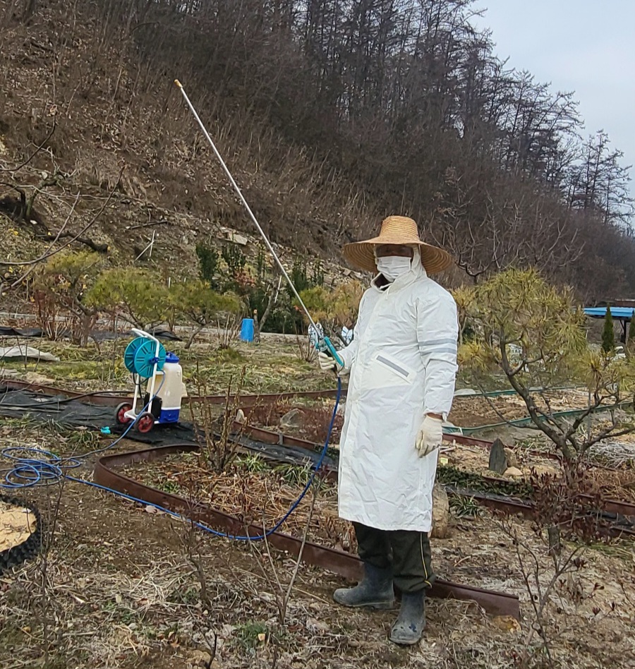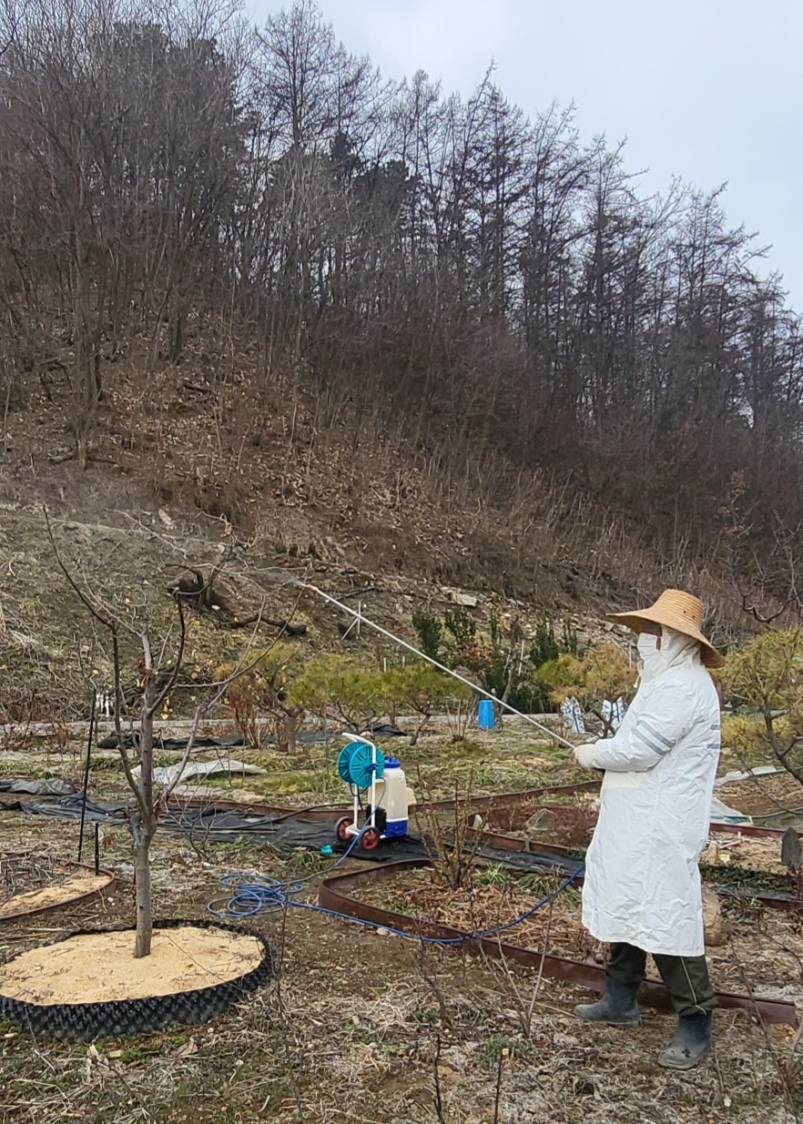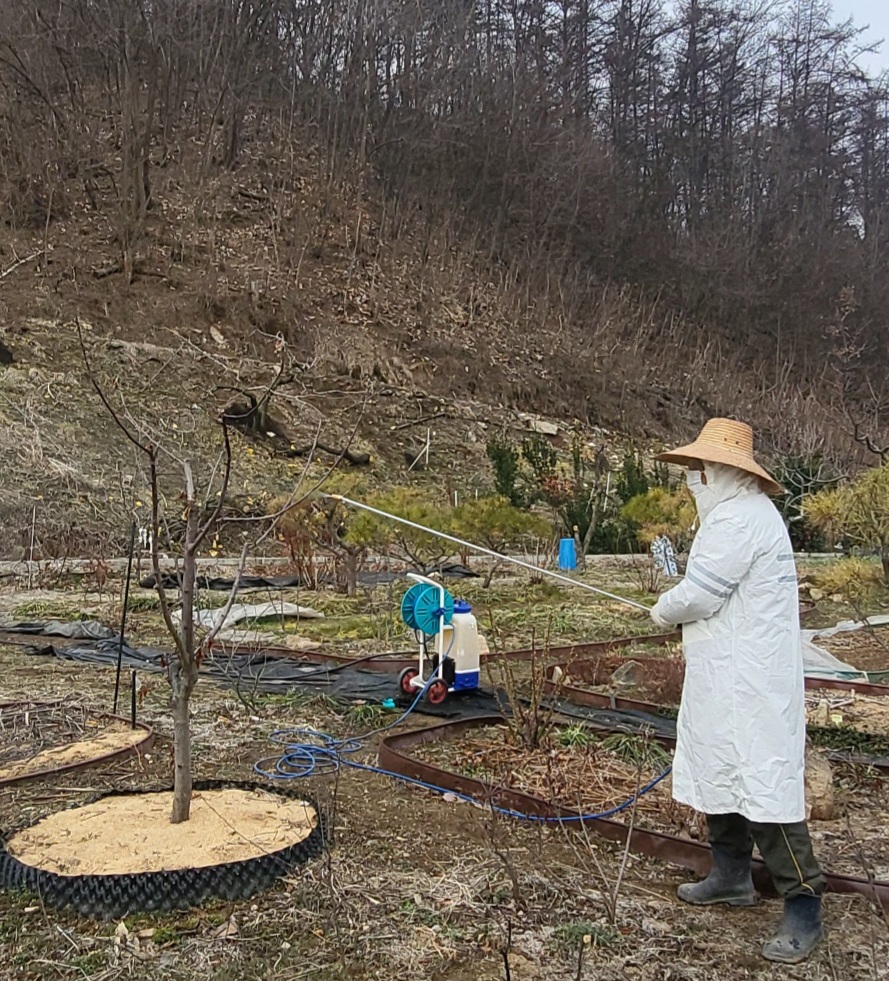 농약 통에 물을 채우고 석회 보르도액과 유황 등 친환경 농약을 넣고 흔들어 섞은 다음 뚜껑을 덮고 호스연결 고리를 단단히 조인 후 과수나무 마다 흡벅 뿌려 주었습니다.