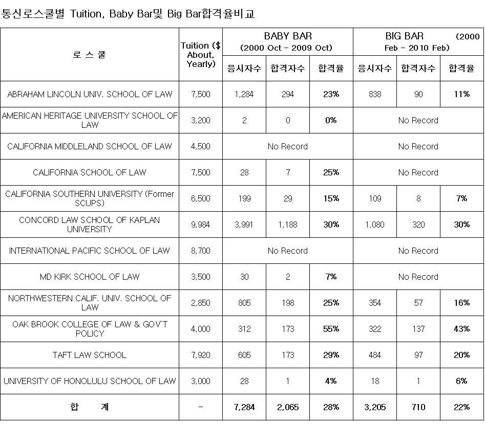 아래의 표는 이러한 변수들을 일목요연하게 분석해보았다. Cal Bar에 흩어져 있는 숫자들을 조탁의 과정을 거쳐 의미있는 통계치로 만들었으므로, 비교적 수월하게 입맛에 맞는 기준을 어림잡을 수 있으리라 생각되고 비교적 단순하다, 설명에 앞서, 짚고넘어가야할 내용이 있는데, 이 숫자들은 2010년 10월 현재 캘리포니아주 법조인협회에 등록되어 있는 현존하는 비인가 통신로스쿨과 원격로스쿨만을 표시하고있다. 이미 사라져 버렸거나, 로스쿨 업무를 중단한 학교들은 제외했다. 어차피 있는 학교들 중에서 선택을 해야하는 입장이라면, 과거의 숫자들이 의미를 부여할만한 것은 아니다.