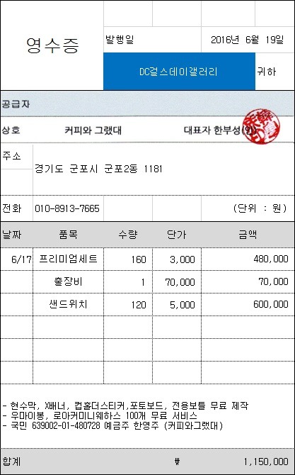 영수증 작성자그대의쏘율|작성시간16.06.19|조회수78 목록 댓글 0 글자크기 작게가 글자크기 크게가 감사합니다. 다음검색 현재 게시글 추가 기능 열기 북마크 공유하기 신고 센터로 신고 댓글 댓글 0 댓글쓰기 답글쓰기 댓글 리스트