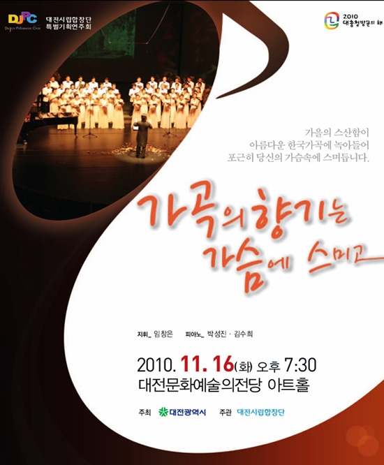 | 시민의 소중한 친구이자 가족으로 문화도시의 자긍심을 심어온 대전시립합창단!세계정상의 하모니로 사랑과 감동을 노래하다.대전시립합창단은 1981년 창단됐다. 창단이후 대전시립합창단은 다양한 연주활동을 통해 절정의 화음을 선보이며 21세기 합창의 모범을 제시해왔다. 2007년 대전시립합창단은 한국합창역사에 새로운 장을 열었다. 합창지휘의 살아있는 전설, 헬무트 릴링의 뒤를 이어받은 합창의 마에스트로 빈프리트 톨을 예술감독 겸 상임지휘자로 영입, 외국인 합창지휘자라는 파격을 선보이며 세계를 활동무대로 삼겠다는 의지를 세웠다. 2008년에는 바흐 B단조 미사 작품 232를, 2009년에는 바흐의 요한수난곡을 원전연주로 선보이며 한국합창음악계에 신선한 충격을 던졌고 한국 합창사에 한 획을 그었다는 평가를 받았다. 대전시립합창단은 정기연주회의 특화된 레퍼토리를 깊이있는 음색, 맑고 고운 하모니로 선보여 찬사를 받았으며 또한 관객의 눈높이에 맞춘 다양한 기획연주를 통해 한국의 대표적 합창단으로 우뚝 섰다. |