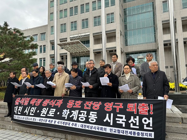 대전 원로ㆍ학계 시국선언 "적반하장 윤석열 폭정 멈춰 세워야" 작성자최재근 모둠티비|작성시간24.11.26|조회수46 목록 댓글 0 글자크기 작게가 글자크기 크게가 http://www.dcdcpost.com/news/articleView.html?idxno=1643대전 원로ㆍ학계 시국선언 "적반하장 윤석열 폭정 멈춰 세워야" - 대충대충포스트대전 지역 시민사회 원로와 학계 인사 등이 "윤석열 폭정 종식과 옹호 잔당 영구 퇴출" 시국선언에 나섰다. 대전비상시국회의와 민주화를 위한 전국교수협의회(민교협) 대전세종지부는 26일 대www.dcdcpost.com #시국선언 #대전 #세종 #시민사회단체 #원로 #교수 #대전비상시국회의 #민주화를위한전국교수협의회대전세종지부 #민교협 #윤석열 #폭정대전비상시국회의와 민주화를 위한 전국교수협의회(민교협) 대전세종지부는 26일 대전시청 북문 앞에서 대전 지역 시민사회 원로 및 학계 인사 등 262인이 참여한 가운데 '윤석열 폭정 종식과 옹호 잔당 영구 퇴출'을 위한 시국선언문을 발표했다. 다음검색 현재 게시글 추가 기능 열기 북마크 공유하기 신고 센터로 신고 댓글 댓글 0 댓글쓰기 답글쓰기 댓글 리스트