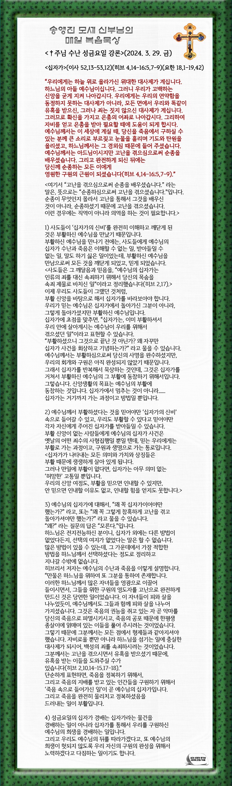 오늘은 주님 수난 성금요일입니다. 사람들에게 멸시받고 배척당하신 주님의 종께서는 우리의 병고를 메고 가셨으며, 우리의 고통을 짊어지셨습니다. 영원한 구원의 근원이 되신 분께서 십자가에 못 박혀 돌아가시고, 무덤에 묻히십니다. 말씀 전례와 십자가 경배를 통하여 주님의 고통과 죽음을 깊이 묵상하며, 주님의 사랑을 깨달을 수 있는 마음의 준비를 하여야 하겠습니다.