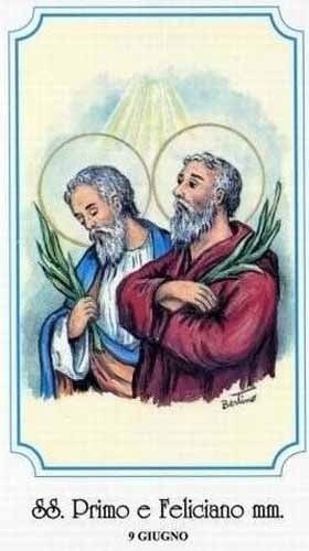 80세의 성 프리무스(Primus)와 성 펠리키아누스(Felicianus, 또는 펠리치아노)는 형제지간으로 로마의 귀족이었으나 그리스도인이 되어 자선활동을 하는 등 열심한 신앙생활을 하였다. 그들은 특히 감옥을 즐겨 방문하여 죄수들을 위하여 봉사하였다. 그러나 그리스도인이란 신분이 드러나게 되자 오랜 동안 피신해 있다가 결국은 체포되었다. 그들이 이교도의 신에게 희생 제사 드리기를 거부하자 즉시 투옥되어 매를 맞았으며, 관리들은 그들을 아주 천천히 죽이기 위하여 이리저리 끌고 다니다가 참수하였다고 한다. 640년 교황 테오도루스(Theodorus)가 그들의 유해를 산 스테파노 로톤도(San Stefano Rotondo)에 안장하였다.
