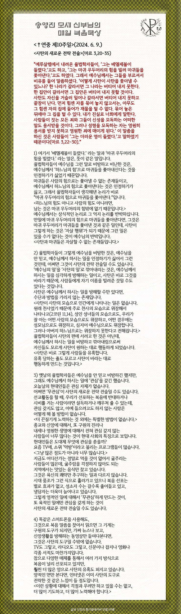오늘은 연중 제10주일입니다. 하느님께서는 성자를 보내시어 우리를 악령의 지배에서 구출하셨습니다. 하느님께서 믿음의 무기로 우리를 도와주시어, 우리가 날마다 악의 세력을 이기고 그리스도께서 이룩하신 파스카 승리에 참여하게 하여 주시기를 청합시다.
