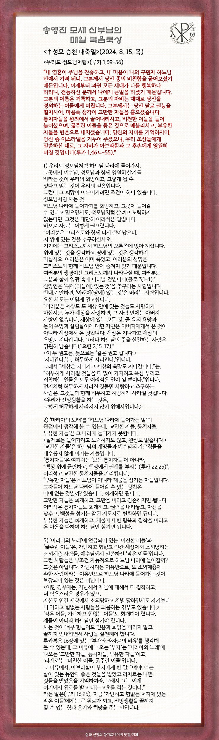 성모승천 대축일은 광복절이기도 합니다. 분단된 조국은 절반의 광복입니다. 언젠가 하나 되는 조국으로 진정한 광복이 이루어지기를 기도하면서 성모님의 전구를 청합니다. “평화의 모후이신 성모 마리아님! 이제와 저희 죽을 때에 저희 죄인을 위하여 빌어주소서, 아멘”