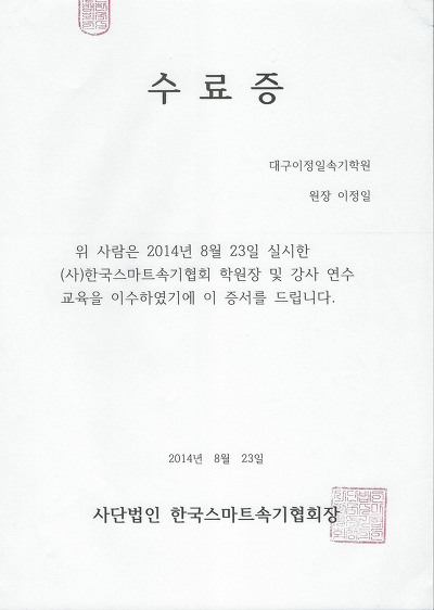 한국스마트속기협회 학원장 및 강사 수료증 작성자속기사 이정일|작성시간14.09.05|조회수84 목록 댓글 0 글자크기 작게가 글자크기 크게가 다음검색 현재 게시글 추가 기능 열기 북마크 공유하기 신고 센터로 신고 댓글 댓글 0 댓글쓰기 답글쓰기 댓글 리스트