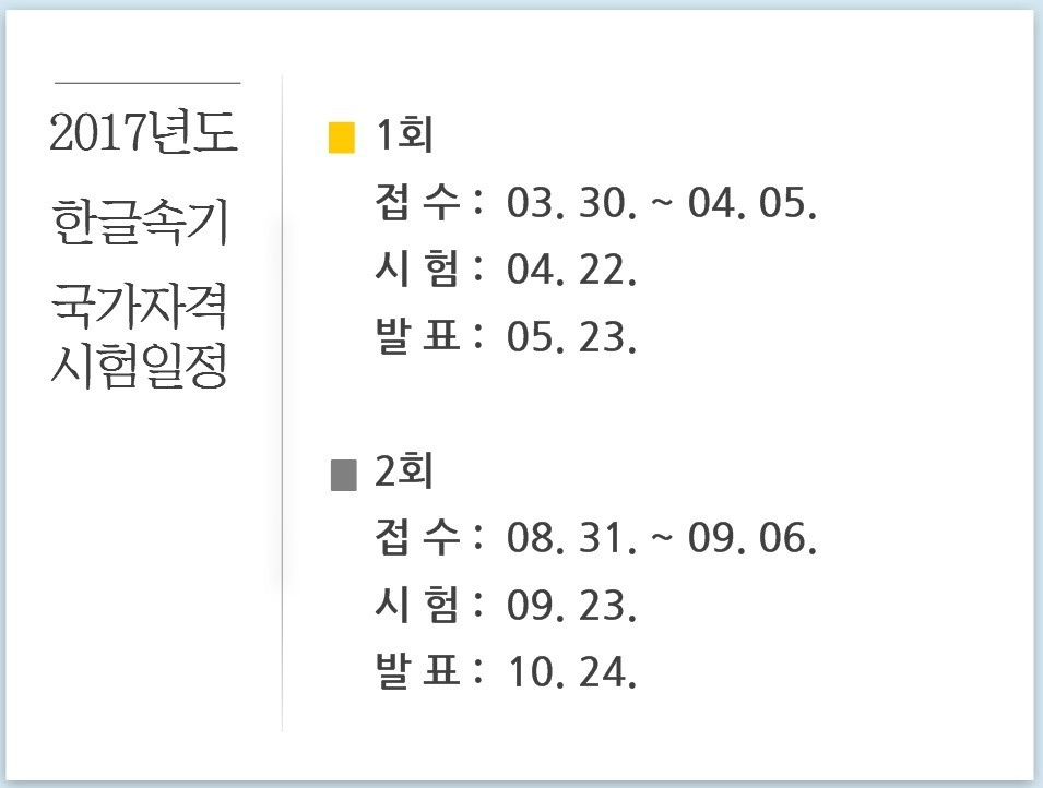 2017년도 속기사(한글속기) 국가자격시험 일정 작성자속기사 이정일|작성시간16.12.12|조회수136 목록 댓글 0 글자크기 작게가 글자크기 크게가 다음검색 현재 게시글 추가 기능 열기 북마크 공유하기 신고 센터로 신고 댓글 댓글 0 댓글쓰기 답글쓰기 댓글 리스트