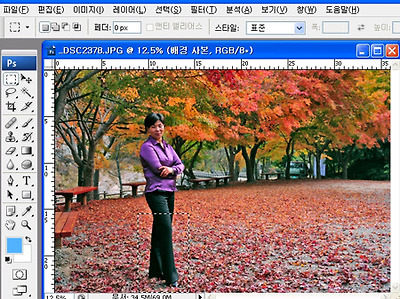 03. 사각형 선택윤곽도구를 선택하여 모델 신체에서 무릅 부분에 걸치게하여 선택해 줍니다.