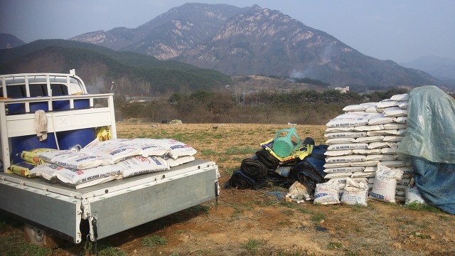 지난해 받아 살포한 뒤에 보관하고 있는 토양개량용 고토석회 "땅심"을 농장 전체 포장에 살포한다.