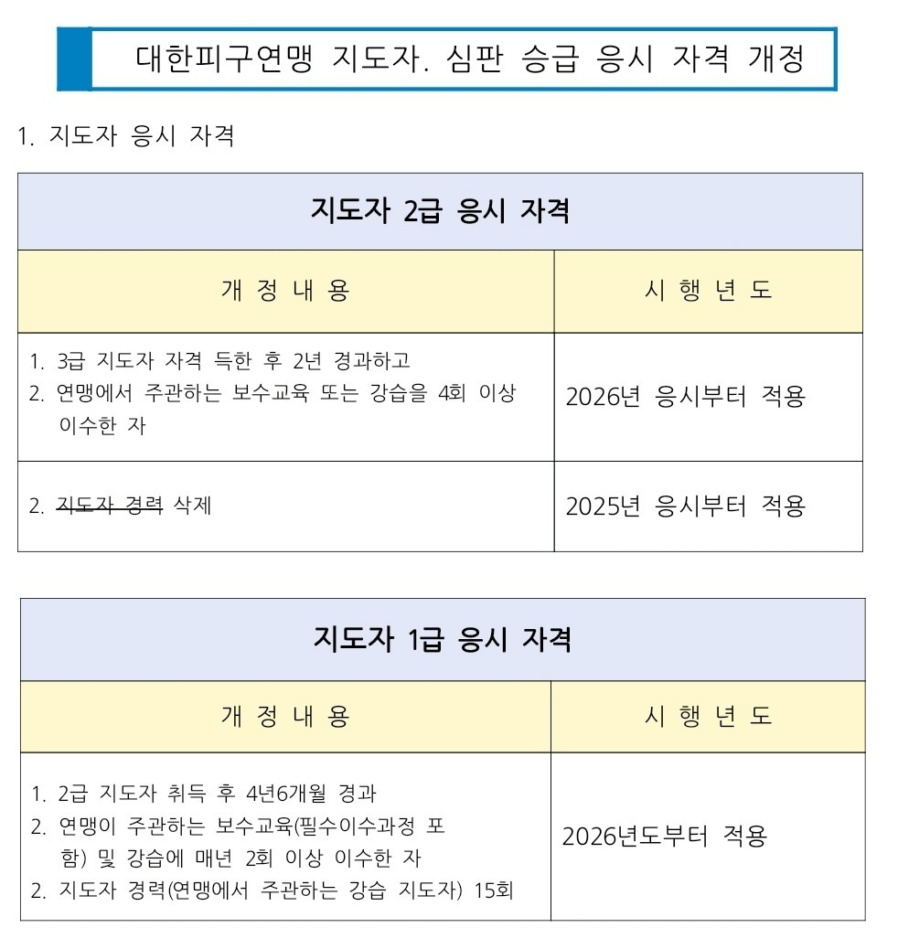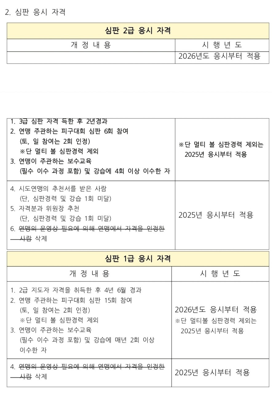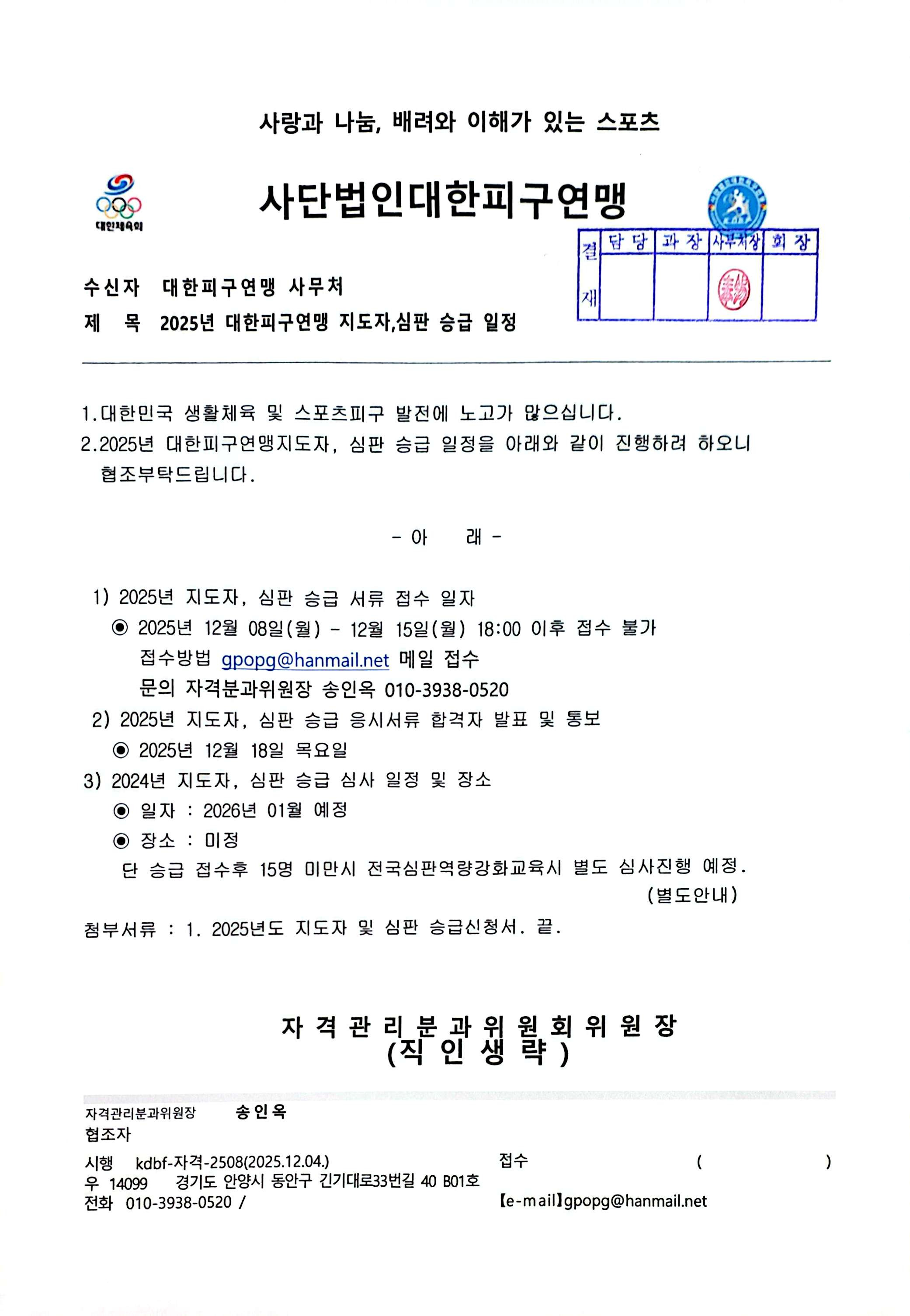 2026 대한피구연맹 지도자 심판 승급심사 안내 작성자대한피구연맹|작성시간25.12.04|조회수447 목록 댓글 0 글자크기 작게가 글자크기 크게가 2026년도 대한피구연맹 지도자 및 심판 승급신청서.hwp64.50KB 첨부파일첨부된 파일이 4개 있습니다. jpg 파일 KakaoTalk_20251204_173059735.jpg 다운로드 jpg 파일 KakaoTalk_20251204_173059735_01.jpg 다운로드 jpg 파일 KakaoTalk_20251204_173059735_02.jpg 다운로드 hwp 파일 2026년도 대한피구연맹 지도자 및 심판 승급신청서.hwp 다운로드 다음검색 현재 게시글 추가 기능 열기 북마크 공유하기 신고 센터로 신고 댓글 댓글 0 댓글쓰기 답글쓰기 댓글 리스트