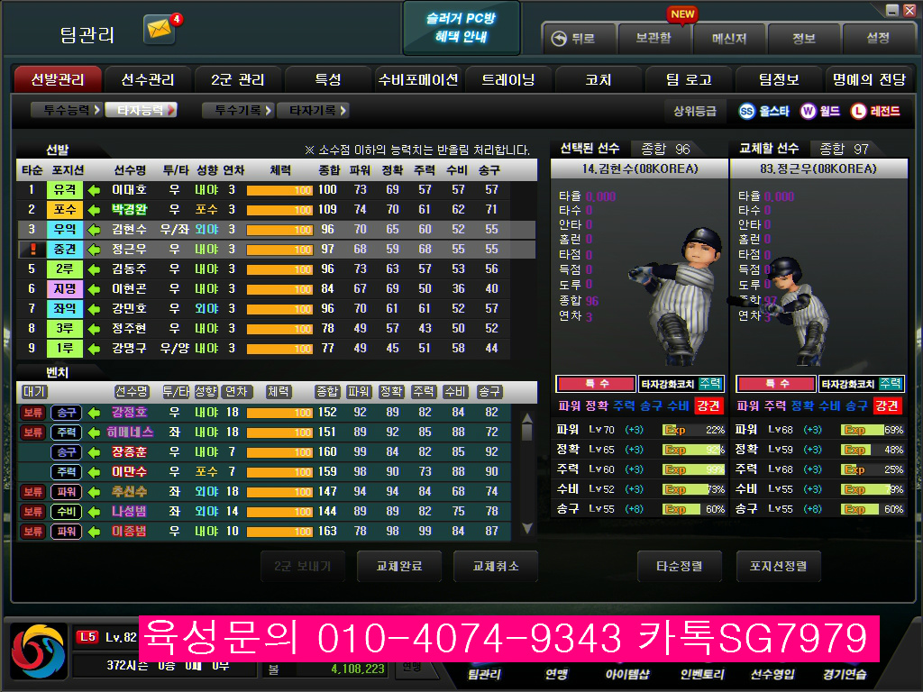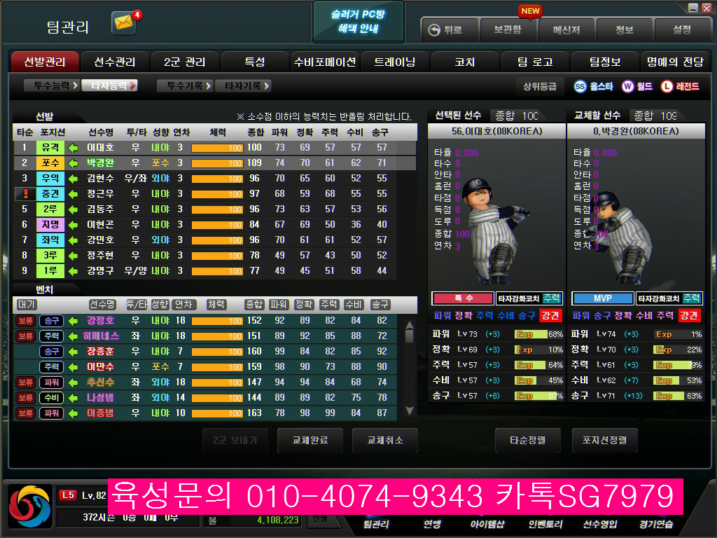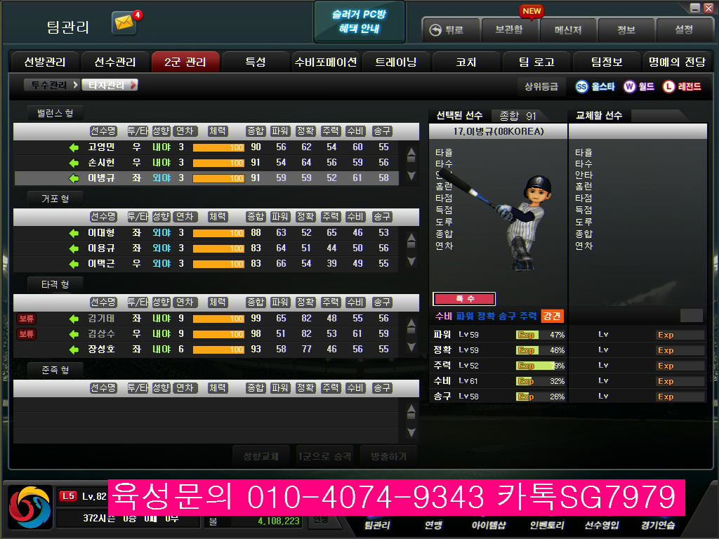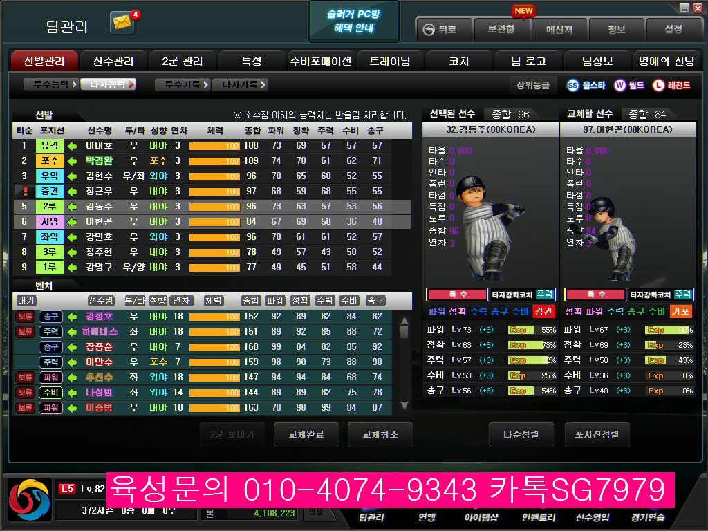 이용구 이택근 이대호 박경완 김현수 정근우 김동주 지명 이현곤 강민호 로 타자 육성이 진행됩니다.