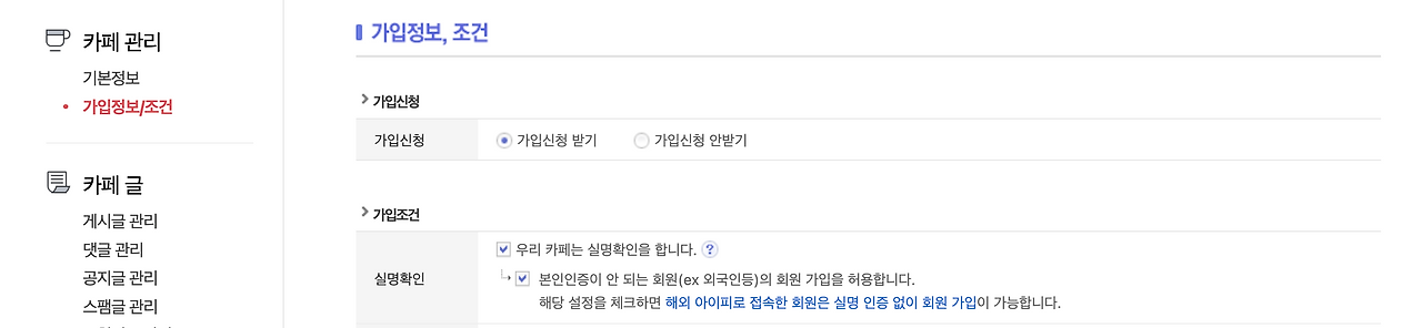 ㄴ 실명인증카페의 경우 카페 관리>가입정보/조건>가입확인안의 실명확인을 체크시 하단에 "본인인증이 안되는 회원의 회원 가입을 허용합니다"를 체크하면 해외에서 접근하여 가입을 하시는 경우 실명 조건 없이 가입을 진행하실 수 있습니다.