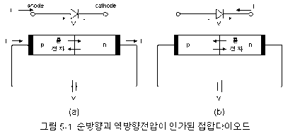 그림 5-1(a)와 같이 전원을 pn접합 다이오드의 p형쪽에 +극을 n형쪽에 대하여 -극을 연결할 때 순방향전압(forward voltage) 또는 순방향 바이어스(bias)가 걸려있다고 말한다. 이 때 다이오드를 통하여 큰 전류 즉, 순방향 전류 (forward current)가 흐른다. 이는 p영역의 hole이 n영역으로, n영역의 전자가 p영역으로 활발히 흐름으로인해 p영역에서 n영역으로 큰 전류
