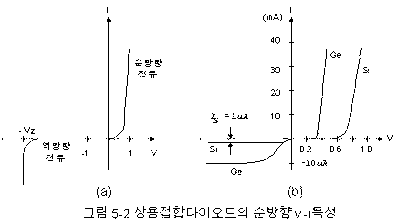 로 포화상태가 된다. 그림 5-2는 접합 다이오드의 v-i특성을 나타내며, 그림 5-2(b)는 Germanium 다이오드와 Silicon 다이오드의 v-i특성을 나타낸 것이다. 이 그림 5-2(b)에서 Si 다이오드는 약 0.7V, Ge 다이오드에서는 약 0.2 V 이상에서 전류가 급격히 증가함을 볼 수 있다. 이 전압을 다이오드의 cutin 전압 또는 문턱전압 (threshold voltage)이라고 한다.