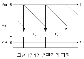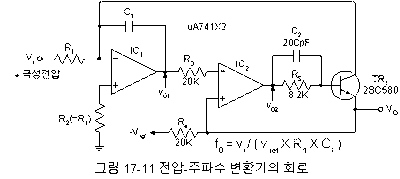 전압-주파수 변환기(Voltage-Frequency Converter, 이하 V-F 변환기라 한다.)는 적분회로로 구성되어 있다. 그림 17-11은 V-F 변환기의 회로로써, 입력 전압 Vi를 IC1으로 반전 증폭을 함과 아울러 C1에 의해서 적분 작용을 하게 된다. 따라서, 이 적분기는 반전된 전류를 입력에 되먹임시키므로 출력 전압 VO는 다음과 같이 나타난다.