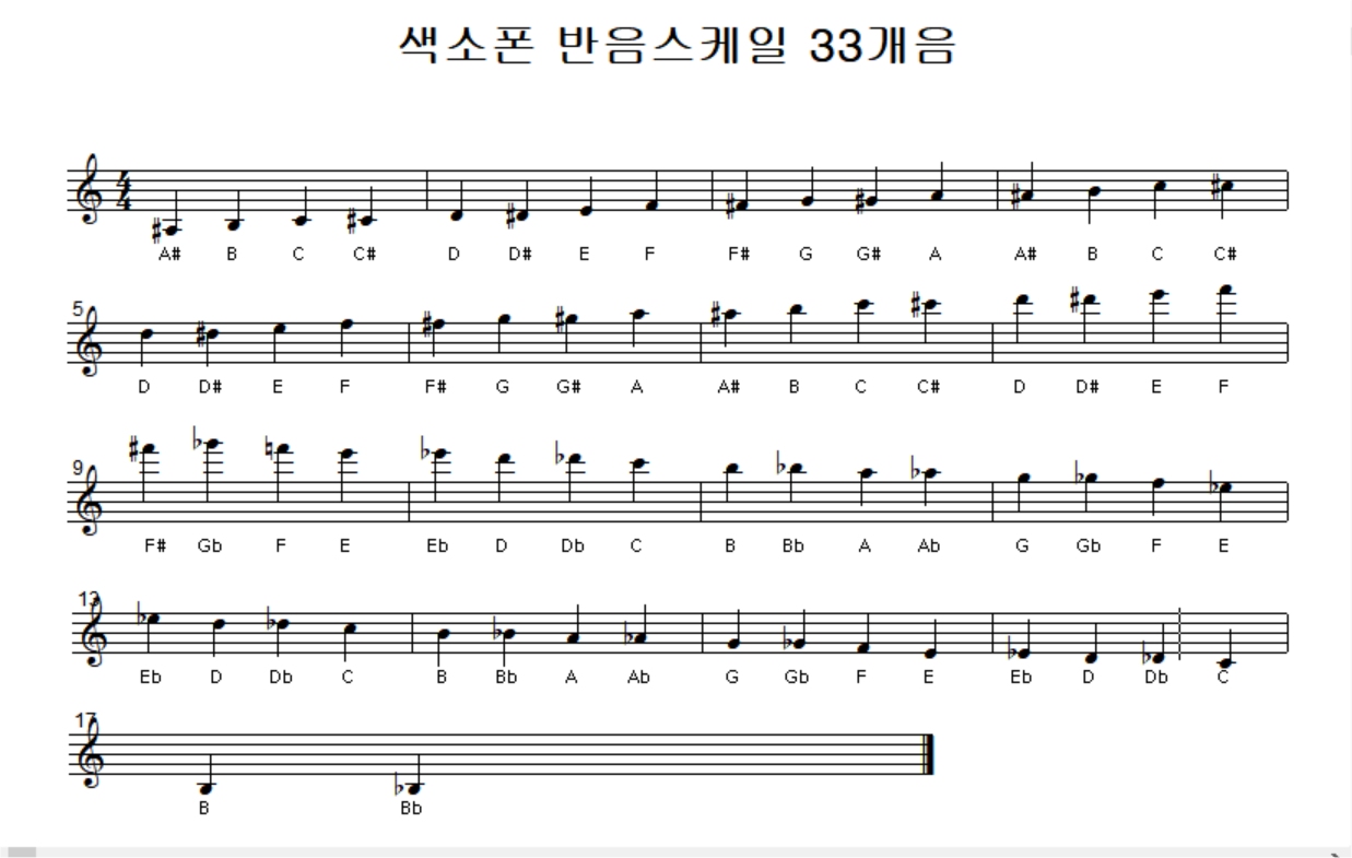 그러면 우리가 연주하는 색소폰 의 핑거링 반음스케일(A#-F#, 표준 33화음)을 알파벳음계를 표기하여 만들어본 것이다. 아래그림을 가지고 알파벳으로 반음계 스케일을 숙달시키는 연습과 크로메틱 연습자료로 활용하기바란다.