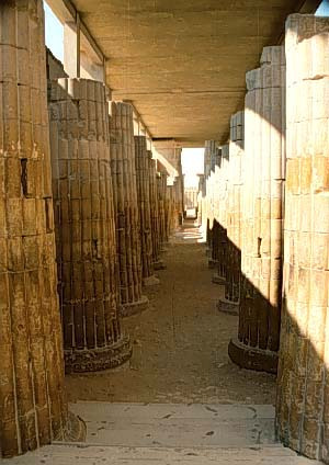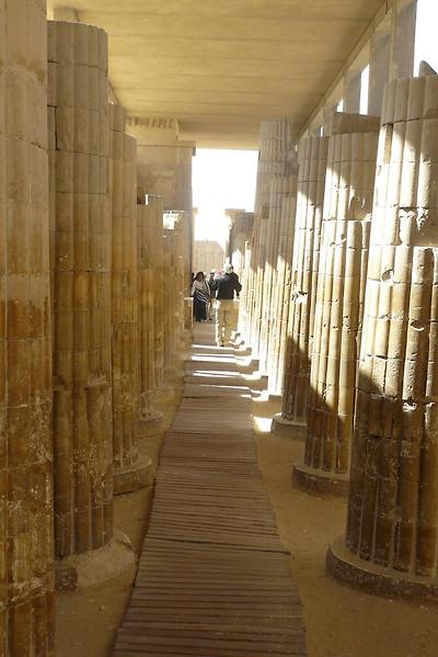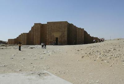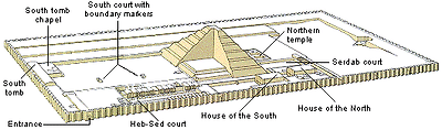 처음으로 세워진, 스텝 피라미드 주변에, 매우 아름답고 정교한 담이 있다. 그 담에는 13 개의 가짜 입구가 있고 오직 하나의 진짜 입구가 있다. 남쪽 끝의 동쪽 담에 있는 주 입구에서, 20 개씩 양쪽에 합 40 개의 기둥이 있는 긴 홀로 들어간다. 각 기둥은 그 사이마다 좁은 방을 형성하며 수직의 벽에 의해 주 담과 연결되어 있다.