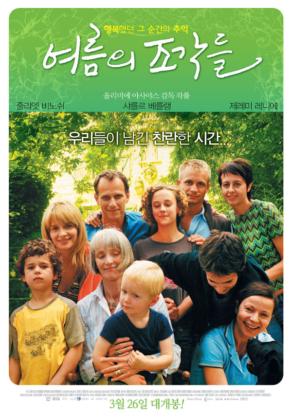 주: 오늘밤(2/27) 11시 5분, EBS 세계의 명화에서 '여름의 조각들'을 제작한 올리비에 아사야스감독의 '클라우즈 오브 실스 마리아'가 방영된다고 합니다. 줄리엣 비노쉬 주연의 영화는 두 번 다시 돌아오지 않는 젊음에 대한 아쉬움과 스치듯 지나가는 젊음을 바라보는 두 사람의 마음을 통해 끊임없이 세상을 재조명하고 그 세상의 일부가 되어 살아남는 법이라는 것과 또 젊음이 우리에게 알려준 것들을 잊어서는 안 된다고 이야기합니다. 그리고 세월과 나이에 대한 성찰뿐 아니라 각 연령대의 캐릭터를 통해 다양한 관점에서 인생 그 자체에 대한 질문을 던지며 시청자들에게 지금 현재 자신의 삶의 모습을 반추하는 계기를 제공할 것입니다. 참고로 수년 전에 올리비에 아사야스 감독의 '여름날의 조각들'을 소개한 저의 글을 다시 올려봅니다.^^*