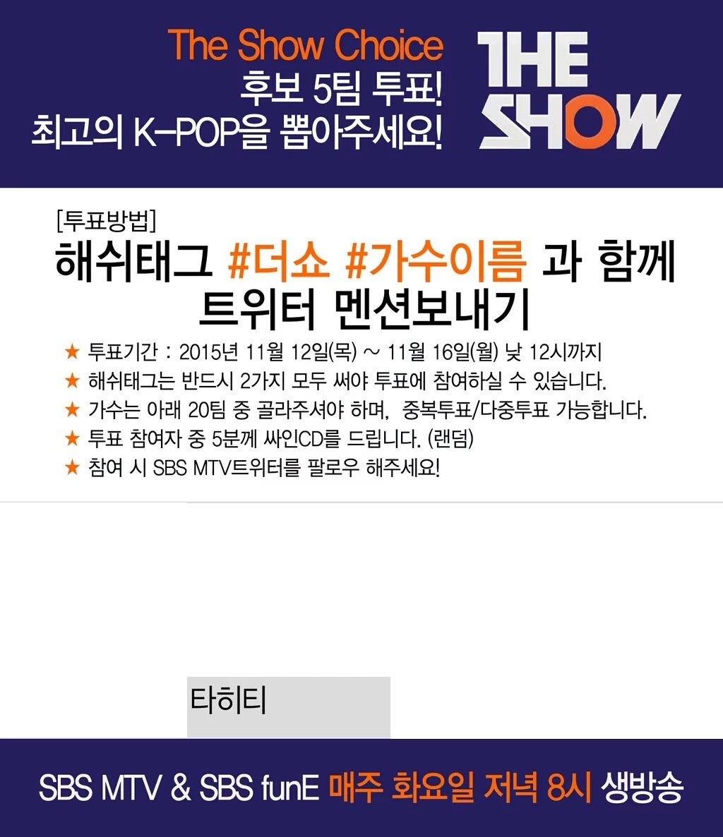 ② 정해진 해시태그 문구(#더쇼, #가수이름) 이외의 특수기호나 문자 입력 시 트위터 집계 시스템상 투표에 반영되지 않을 수도 있습니다.
