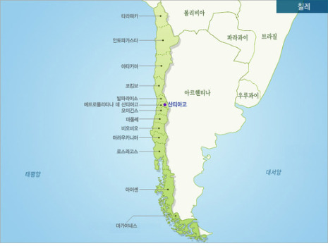 칠레는 위아래로 그 길이가 무려 4000km를 넘는 세계에서 가장 긴 나라이다. 이 긴나라 한쪽 전부가 바다와 직면에 있으니 정말 바다와 밀접한 관계를 갖고 있는 나라다. 북쪽으로 페루, 북동쪽으로 볼리비아, 동쪽으로 아르헨티나와 국경을 접하며 서쪽으로 태평양, 남쪽으로는 남극해에 면한다. 다시 말해, 안데스 산맥을 따라 남북으로 길게 발달한 칠레는 환태평양 지진대에 속하기 때문에 지진 활동이 매우 활발한 것이다. 하지만 걱정할 것은 없다. 8.5 규모의 강진에도 아이티에 비해 피해가 적었던 이유는 그만큼 칠레가 지진에 내진 설계 등의 대비책이 완벽하기 때문이다.