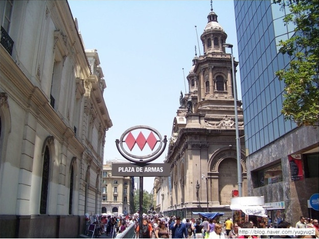 산티아고 역시 칠레의 수도이지만, 아르마스 광장에서 보면 산티아고의 자유분방한 도시 분위기를 느낄 수가 있었다. 광장에 들어서면, 칠레의 역사와 전통을 느낄 수 있다. 아르마스 광장 입구에는 원주민 흉상이 있다. 곳곳에는 화가, 조각가들이 작품활동을 하고 있으며, 거리의 악단들의 모습이 보인다. 군부 쿠테타 당시 피로 얼룩진 모네다 광장이 이 인근이지만, 지금 보면 언제 그런 굴곡의 역사가 있었는지 감조차 오지 않을 정도다. 위치는 마포초강과 오이긴스 거리 사이에 있는데, 공원 안에는 16세기 산티아고의 개척자 발디비아의 동상과 독립기념비가 서 있다. 주위에 시청사, 중앙우체국, 국립역사박물관, 대성당, 산티아고 박물관 등이 있기 때문에 시 중심부라 할 만하다. 시가의 중심부에는 근대적인 고층건물이 많으며, 1647년 파괴되었다가 1748년에 재건된 카테드랄을 비롯한 많은 교회, 남아메리카 최대를 자랑하는 국립도서관·국회의사당·관청·대통령관저·국립박물관·칠레대학·가톨릭대학·시립극장·금융기관 등이 있고, 북쪽의 크리스토발 언덕에는 22m의 성모 마리아상(像)이 세워져 있다. 또한 칠레에는 식민지시대에 있었던 건축물이 남아있어 관광지로서 뼈아픈 고통을 느낄 수 있는 곳이다. 총독 관저, 메트로폴리탄 대성당, 조폐국, 영사 재판소, 산프란시스코 교회, 산토도밍고 교회, 레콜레타 프란시스카나, 자비의 교회 등이 남아 있다. 코우시뇨 궁전이 대표적인 19세기 건축물이며 미술 궁전, 독립도서관, 연합 클럽 등에 20세기 초의 양식들이 반영되어 있다. 현대식 건축물 들은 비타쿠라, 산루이스 산, 로쿠로에 있는 주거지에서 주로 볼 수 있다.