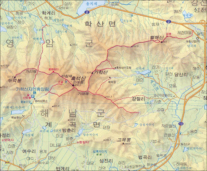 제전마을▶암릉지대▶ 전위봉▶암릉지대▶벌뫼산▶질재▶전망대 ▶가학산▶ 가리재▶ 노적봉▶흑석산(깃대봉)▶바람재▶가학산자연휴양림 | ||||||||||||||||||||||||||||||||||||||||||||||||||||
