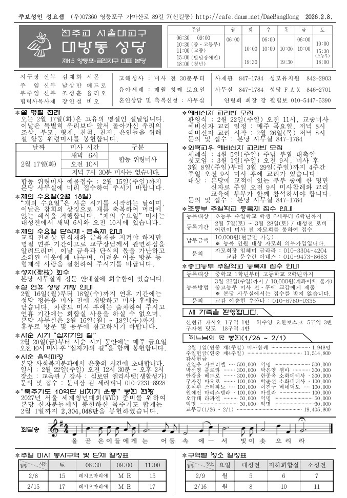 2026년 02월 08일 연중 제5주일 주보 작성자율리|작성시간26.02.07|조회수159 목록 댓글 0 글자크기 작게가 글자크기 크게가 다음검색 현재 게시글 추가 기능 열기 북마크 공유하기 신고 센터로 신고 댓글 댓글 0 댓글쓰기 답글쓰기 댓글 리스트