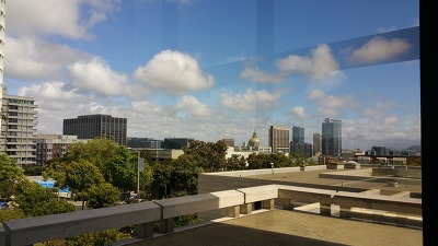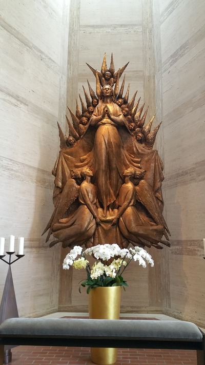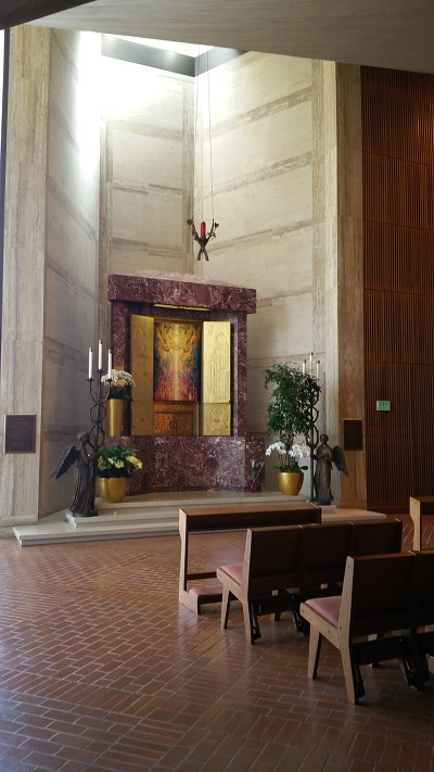 감실, 성모승천상, 그리고 그 옆 통유리에서 바라본 샌프란시스코 풍경입니다. 돔지붕으로 된 것이 샌프란시스코 시청입니다.