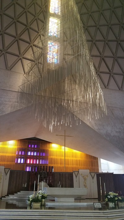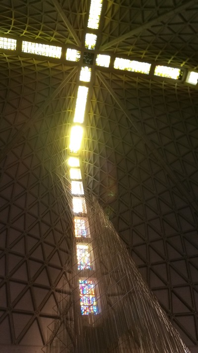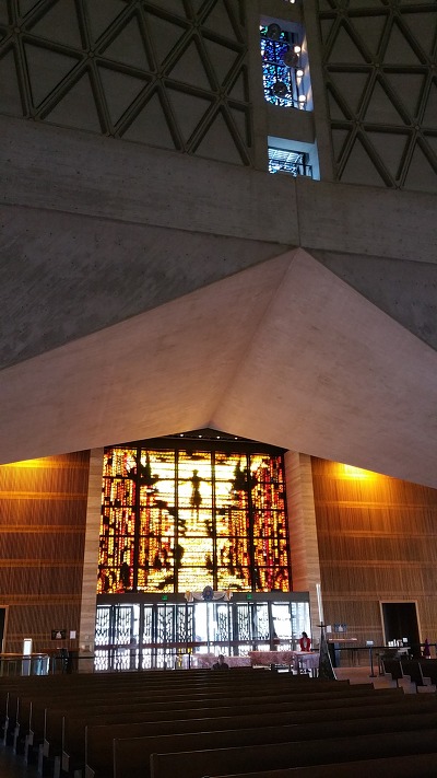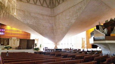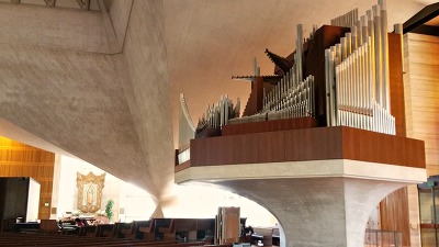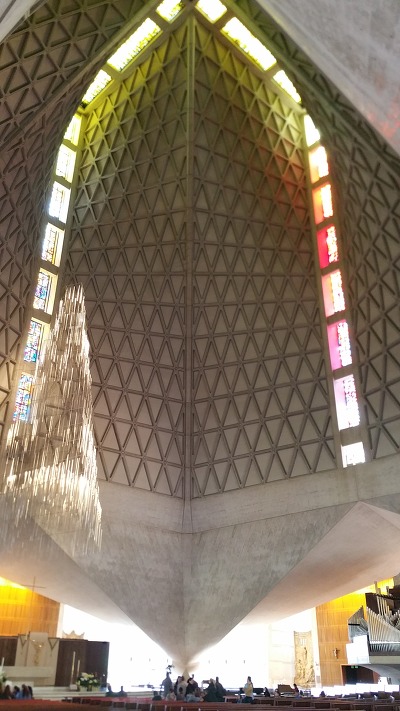 그리고 그 지붕이 한 공간입니다! 성당 한쪽 모서리에서 올려다 보고 찍은 사진입니다. 엄청나게 높은 천장이 특별한 울림을 만들어 냅니다. 잔향이 길어서 아카펠라 하기에 좋습니다. 콘크리트 내장을 개인적으로 좋아하지 않지만, 여기는 아름다운 구조물들 덕분인지 저한테도 느낌이 좋습니다.