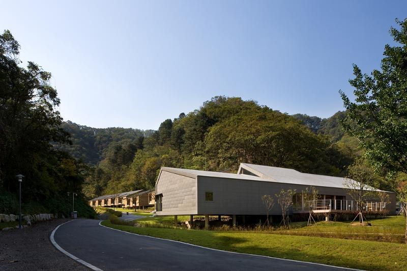 숙박시설과 음식점이 몰려있는 강촌 유원지쪽에서 살짝 떨어진 산자락, 계곡길을 따라 흘러내리는 땅모양위에 부드럽게 올라앉은 이 건물이 있습니다. 서울시립대 수련원입니다.
