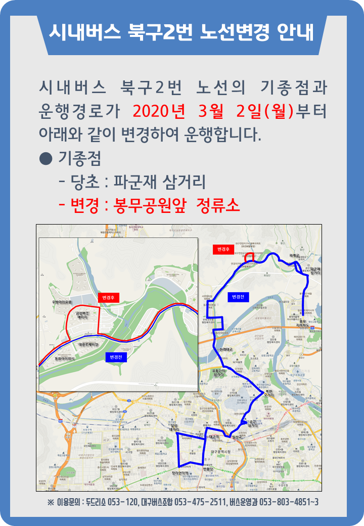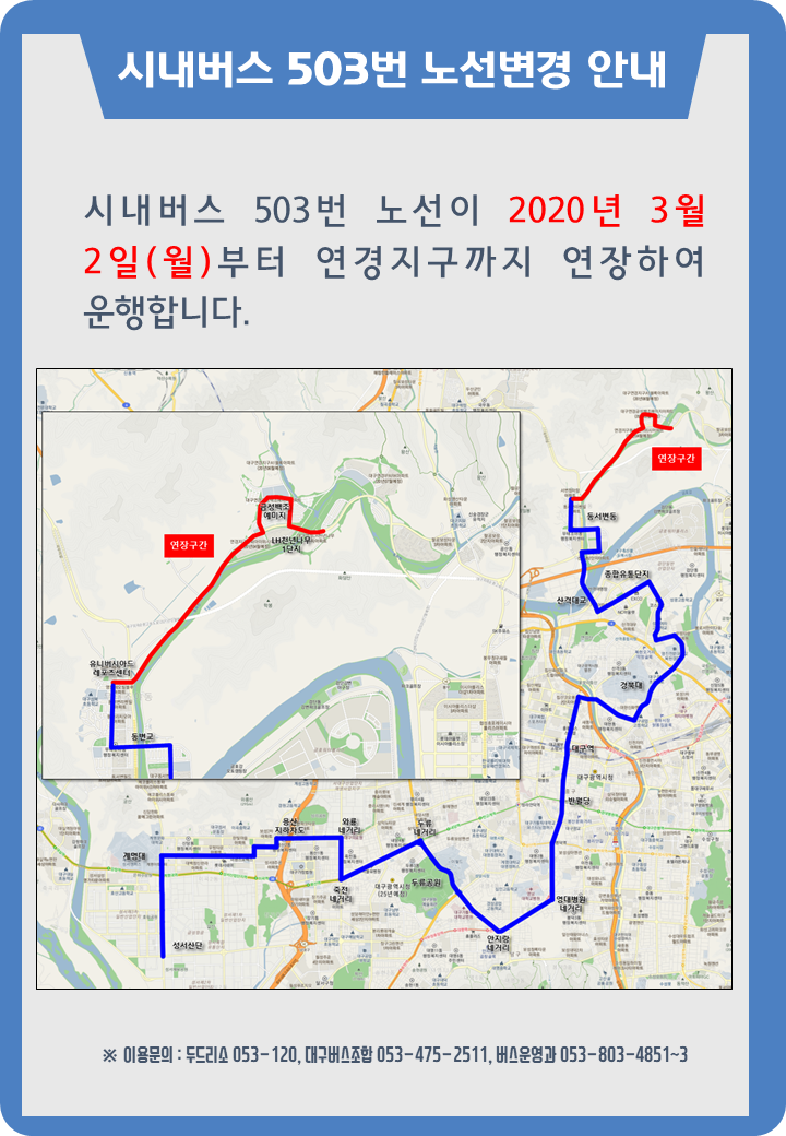 2020년 3월 2일(월)부터 아래와 같이 503번과 북구2번 시내버스 노선의 운행경로를 변경하여 운행합니다