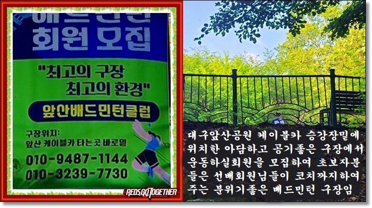 회원모집충 작성자수암강재창|작성시간24.05.12|조회수87 목록 댓글 0 글자크기 작게가 글자크기 크게가 대구앞산공원 케이불카 매표소밑에 앞산배드민턴클럽에서회원모집 하고있으니 많이 등록하세요 다음검색 현재 게시글 추가 기능 열기 북마크 공유하기 신고 센터로 신고 댓글 댓글 0 댓글쓰기 답글쓰기 댓글 리스트