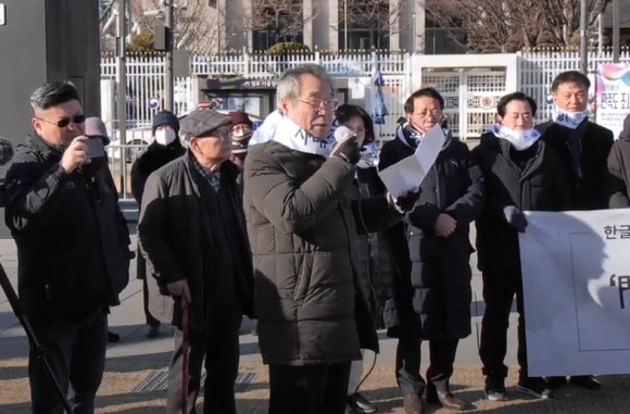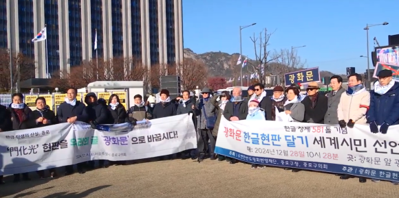 한글 창제 581돌을 맞이해 12월 28일 10시 28분에 재외 동포 단체 대표들과 시민들이 한글을 창제한 경복궁 광화문 앞에 모여 “한글 창제 581돌 기념 광화문 한글현판 달기 세계시민 선언 기자회견”을 했다. 이날 기자회견에는 주최자인 김덕룡 유엔한반도평화번영재단 이사장이 개회 선언을 하고, 정대철 헌정회장과 최홍식 세종대왕기념사업회장에 이어 김삼열 독립유공유족회 회장 들 민족운동단체와 서종환 종로평생교육원장과 사회 지도자들, 라도균 종로구의회의장과 김미경 은평구청장들 서울시 공직자들과 시민 수백 명이 참석해 “한글이 태어난 경복궁의 정문인 광화문에 훈민정음 글꼴로 한글현판을 달고 한글을 살리고 빛내어 세계문화문명을 꽃피우자!”라고 외친 민족사에 길이 빛날 뜻깊은 민족문화 빛내기 큰 선언이었다. 이번 광화문 한글현판 달기 세계시민 선언은 오늘날 관광용으로 다시 지으면서 단 부끄러운 한자현판을 떼고 세계 으뜸 글자인 한글로 달아서 우리 자긍심과 자부심을 세우고 국운 상승 깃발로 삼자는 뜻깊은 일이었다. 한마디로 문화재복원이라는 명목으로 우리를 부끄럽게 하는 역사 복원, 한자복원 차원을 넘어 세종대왕이 한글을 만든 새 문화 창조 정신 차원에서 한글을 빛내어 인류문화발전에 이바지하자는 큰 부르짖음이었다. 또한 모든 소리를 적을 수 있는 세계 으뜸 글자인 한글이 세계인들의 사랑과 인정을 받고 한글을 배우려고 한국으로 몰려오는 때에 한글이 태어난 곳이고 대한민국 얼굴인 광화문에 한글문패를 달고 한글을 더욱 빛내자는 것은 시대 역사 사명이다. 한글단체는 지난 2005년 문화재청이 40여년 걸고 한글을 살리고 빛내어 나라를 일으키는 깃발이었던 한글현판을 떼고 한자현판으로 바꾸어 달겠다고 할 때부터 지금까지 19년 동안 끈질기게 한글이 태어난 곳인 경복궁 정문에 한자현판 다는 것을 반대 했다. 한글이 태어나고 400년이 넘도록 쓰지 않다가 나라가 망했고, 일본 강점기에 한글이 사라질 번했으나 일본 식민지에서 벗어난 광복 뒤부터 한글을 살리고 써서 나라를 일으킨 대한민국 돈으로 부끄러운 조선시대 중국 속국 상징인 한자현판을 다는 것은 어리석고 못난 일이기 때문이다. 그러나 문화재청은 문화재복원은 원형복원이 원칙이라는 허울 좋은 명분을 내세우며 국민의 소리를 듣지 않았다. 그래서 이날 국내외 동포들 지지서명을 받아 “한글 창제 581돌 기념 광화문 한글현판 달기 세계시민 선언”기자회견을 했는데 이번 행사를 주최한 김덕룡 유한한반도평화번영재단 이사장은 “이번 대회는 한글단체는 말할 것이 없고 재외동포와 민족지도자들까지 힘을 모았다는 데 한글발전사에 일대 획을 긋는 큰 사건이다.”라고 말을 했고, 공동 대회장인 최홍식 세종대왕기념사업회 회장은 “새해는 세종대왕이 태어나신 날이 국가기념일이 된 첫해이고 한글광복 80돌이 되는 뜻깊은 해다. 꼭 한글이 태어난 곳인 경복궁 정문에 훈민정음 글꼴로 한글현판을 달아야 한다.”라고 했고, 김형률 미주한인상공회의소총연합회 이사장은 “세계인들이 한국문화와 한글을 배우려고 몰려오는 마당에 대한민국 얼굴인 광화문에 한자현판이 걸려있는 것을 우리겨레 망신이다. 재외 동포들은 꼭 자랑스러운 한글현판으로 바꾸어달기를 간절히 바란다.”라고 외쳤다. 이밖에 김정배 민주평통유럽중동아프리카 부의장, 김주원 한글학회 회장, 최재형 전 감사원장,김미경 은평구청장, 윤경로 전 한성대총장, 서종환 종로평생교육원 원장, 김삼열 독립유공자유족회 회장, 안모세 대한민국3.1회 회장, 곽영훈 유엔한국협회 회장, 김태균 탄자니아한인회장, 이창덕 외솔회 회장, 이주화 세종왕자영해군파종회 회장, 이찬희 한국스카우트연맹 총재, 성원식 성상문 후손 창녕성씨화수회 회장, 김준일 한문화재단 이사장, 소복자 민주평통칭따오협의회 회장, 배보균 중국불산시한인상공회장, 이원자 유엔피스코 호지민협의 회회장, 고영회 전 대한변리사회 회장, 상병현 세종시의회 회장, 오훈필 한갑수기념사업회 회장,안모세 대한민국 3.1회 대표, 최노석 한국언론포럼 대표 들 많은 국내외 지도자들이 참여해 하나같이 한글현판을 달아야 한다고 외쳤고, 라도균 종로구의회 의장이 주최 측으로서 참여한 국내외지도자 여러분에게 고마운 인사를 했다. 그리고 이날 선언문은 1968년 정부가 한글전용정책을 펴게 하고 광화문에 한글현판을 달게 한 58년 된 연세대 한글사랑 동아리 한글물결 고명진 대표가 읽었는데 “광화문에 한글현판을 달고 한글을 더욱 빛내자! 한글은 세계 으뜸 글자로서 대한민국 국가유산을 넘어 인류문화유산이다. 이 한글이 태어난 곳에 한글현판을 달고 한글을 빛내어 세계문화발전에 이바지하자! 오늘날 경복궁 광화문은 대한민국 체면을 세우려고 오늘날 새로 지은 관광용 건축물이다. 이곳에는 한자현판보다 한글현판이 더 어울리고 가치가 크다! 한글이 태어난 곳인 경복궁의 광화문에 훈민정음 글꼴로 현판을 달고 한글을 더욱 빛내어 한글문화를 꽃피우자고 한글을 사랑하는 세계시민이 원한다!”라고 밝혔다. 이날 참석자들