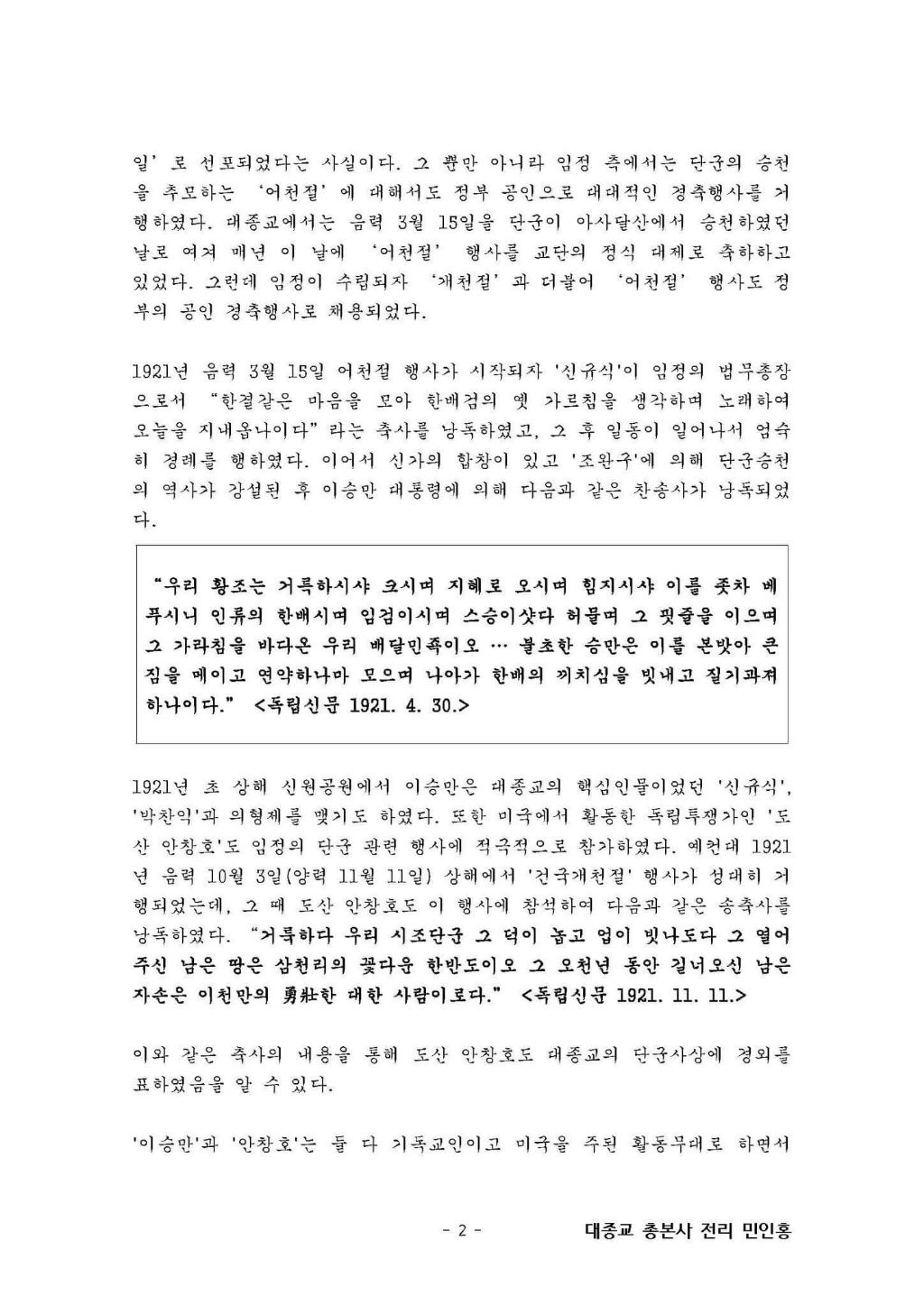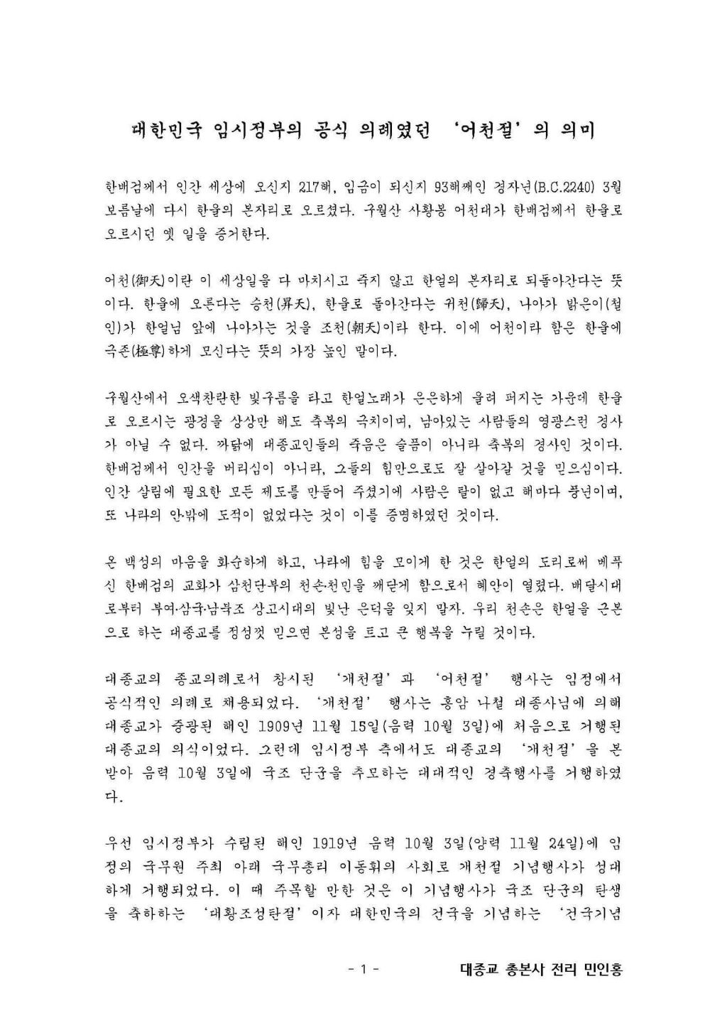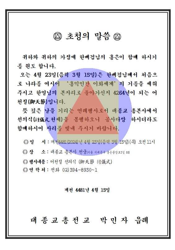 어천절(2024. 4. 23 화) 작성자청년회장|작성시간24.04.15|조회수16 목록 댓글 0 글자크기 작게가 글자크기 크게가 4월 23일(음력3월 15일)은 '대한민국임시정부'에서도 공식 의례로 거행했던 '어천절' 입니다. 다음검색 현재 게시글 추가 기능 열기 북마크 공유하기 신고 센터로 신고 댓글 댓글 0 댓글쓰기 답글쓰기 댓글 리스트