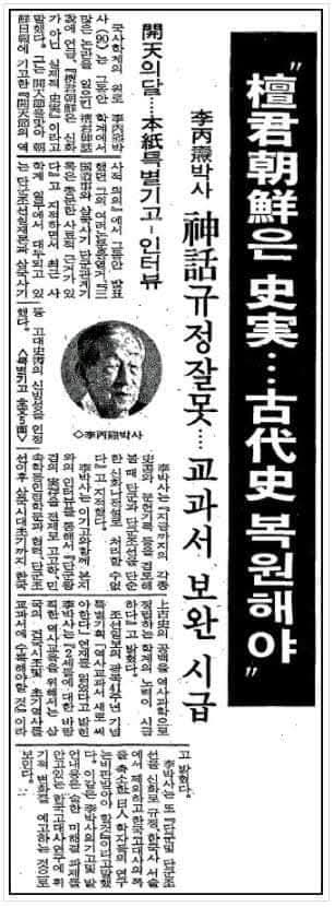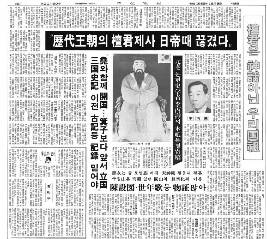 1986년 10월 9일자 조선일보에 게재된 원로 사학자 두계 이병도 박사의 특별 기고문을 정리해 본다. 이 글은 평생 실증사학을 추구했던 저자가 만년에 단군을 신화가 아닌 실재했던 우리 민족의 국조(國祖)로 인정하며, 그 역사적 근거를 밝힌 기념비적인 글이다.