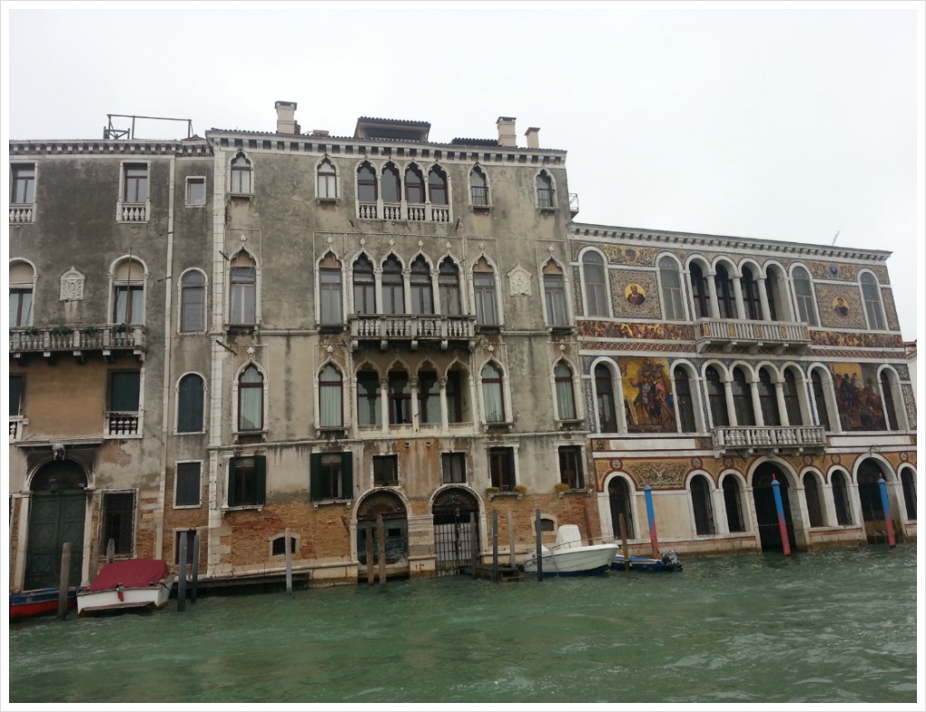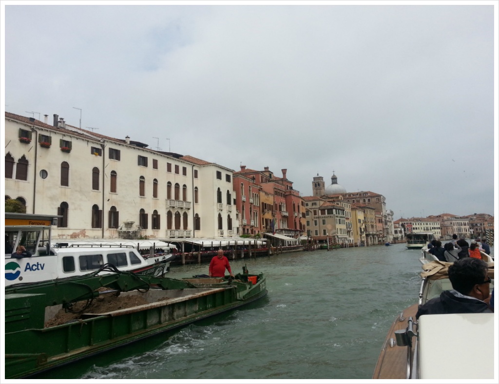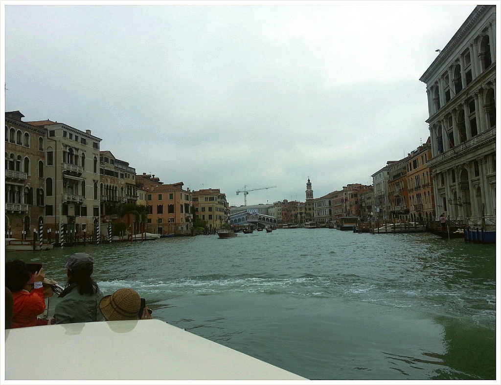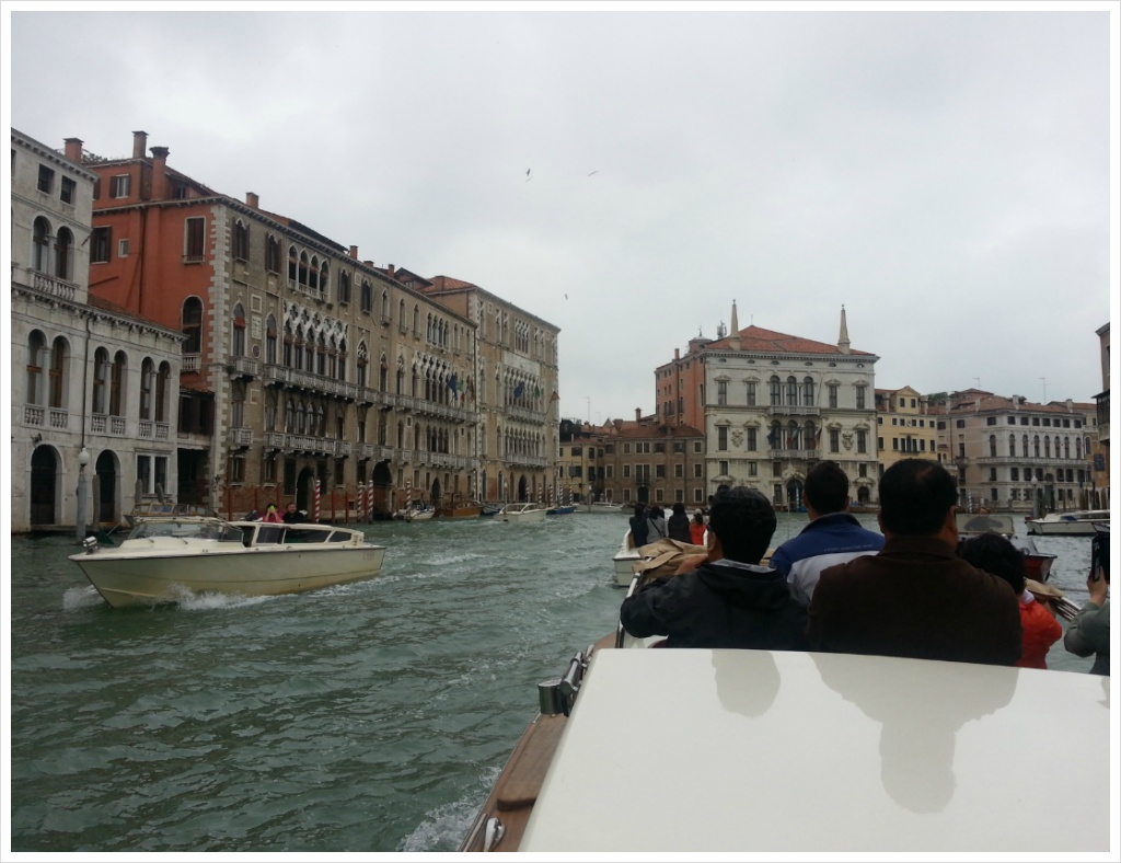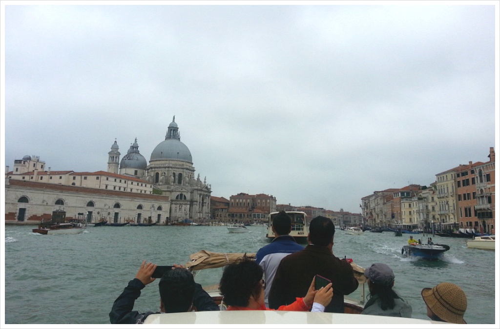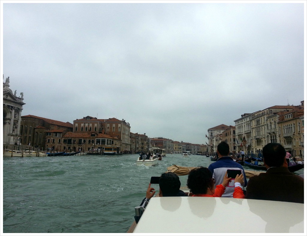 살루테 성당 앞을 지나 대운하에 진입한 후 계속하여 눈앞에 펼쳐진 광경은 언젠가 그림으로 보았던 바로 그 모습이었다. 도심을 흐르는 강 같은 대운하의 양안으로 각각 다른 양식으로 지어진 중세풍의 유서 깊은 건축물들이 즐비하여, 시야에 들어오는 순간순간의 장면이 모두 한 폭의 그림이었다. 오랜 세월에 건물이 낡고 빛이 바래서 우중충해 보이는 부분도 있었지만 전체적인 아름다운은 여전하였다. 선두에 탑승한 가이드는 수신기를 통해 “이쪽을 보세요, 저쪽을 보세요.”를 반복하며 특정 건축물의 이름과 유래에 대해 설명하였다. 우리는 가이드가 손짓하는 방향을 따라 휴대폰 카메라를 들이대며 연신 셔터를 눌러대었지만 그 대상이 너무 많아 곧 지쳐버렸다.