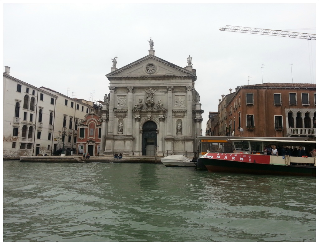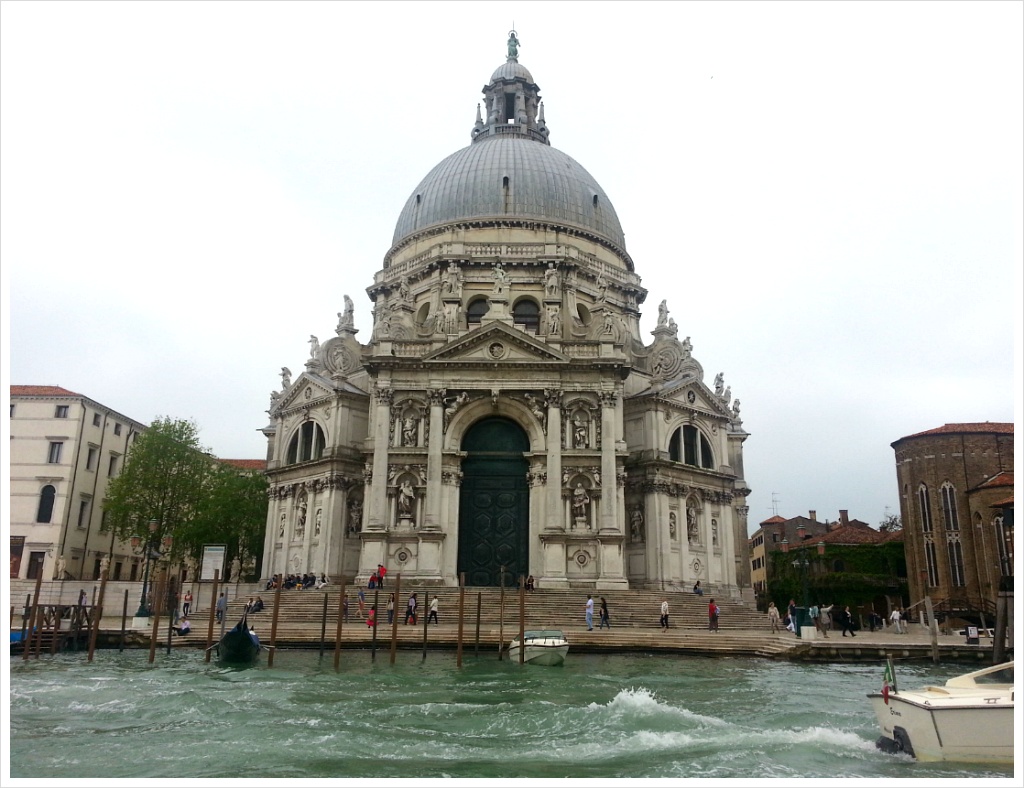 수상택시를 타고 대운하 입구에 들어서니 멀리서 보았던 산타 마리아 델라 살루테 성당이 먼저 나타났다. 이 성당은 베네치아 바로크 양식을 대표하며 팔각형의 바닥 위에 세운 커다란 돔이 아름답기로 유명하다. 1630년 페스트로 인해 베네치아 인구의 약 20%에 해당하는 4만 7000명이 목숨을 잃었는데, 이때 페스트로부터 목숨을 보존한 시민들이 성모 마리아에게 감사를 표시하기 위하여 세운 것이 이 성당이라고 한다.