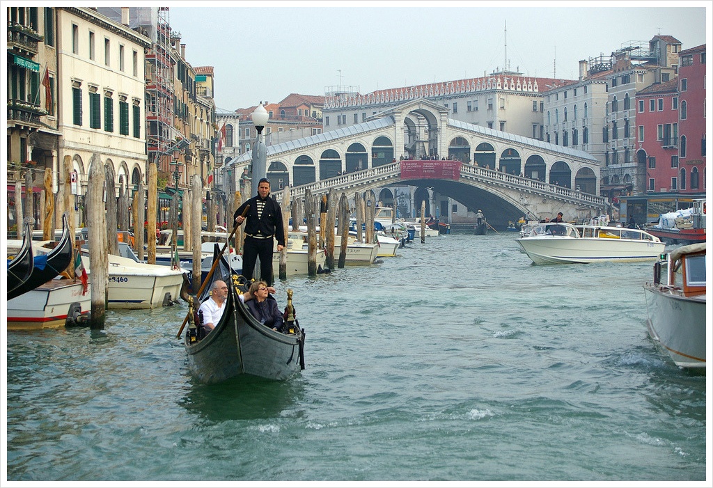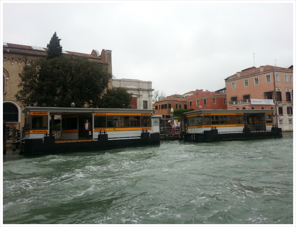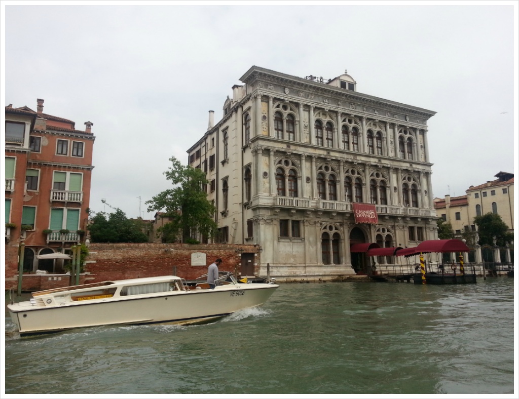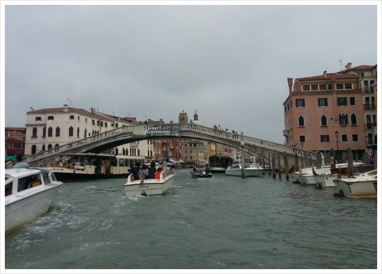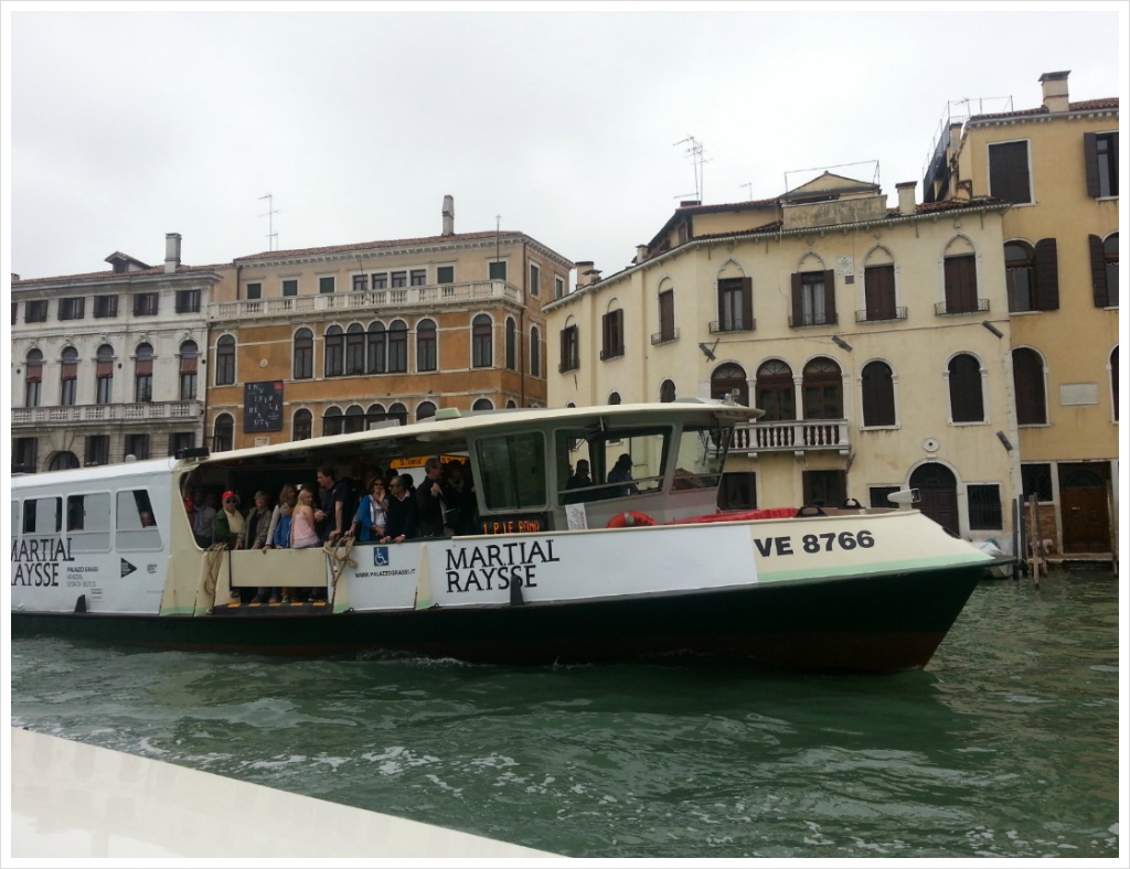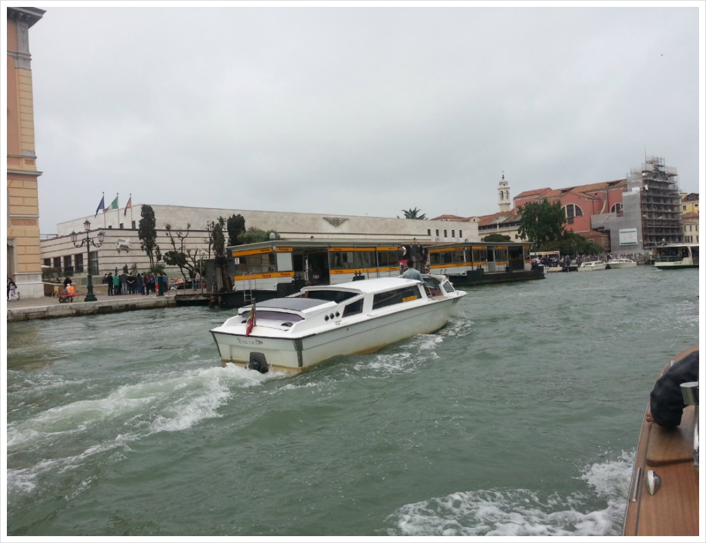 우리는 12시 50분경에 앞서 곤돌라를 탔던 두칼레 궁전 앞 선착장으로가 수상택시를 타고 베네치아 대운하(Canal Grande)를 따라 달리며 주변의 아름다운 경관을 감상하였다. 베네치아에는 자동차가 없는 것이 특징으로 물의 도시라는 특성상 수로가 곧 도로이며 배가 자동차를 대신하여 운송수단이 된다. 육지에서 버스역할을 하는 선박이 바포레토(Vaporetto)라고 부르는 수상버스이고, 택시역할을 하는 모터보트가 수상택시이다. 노를 저어 다니는 곤돌라는 관광용 택시에 해당하는 셈이다. 그리고 갈지자(之) 형태로 3.8km에 이르는 대운하는 중앙대로에, 건물사이의 폭이 좁은 수로는 이면도로에 비유할 수 있다.
