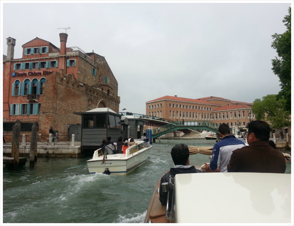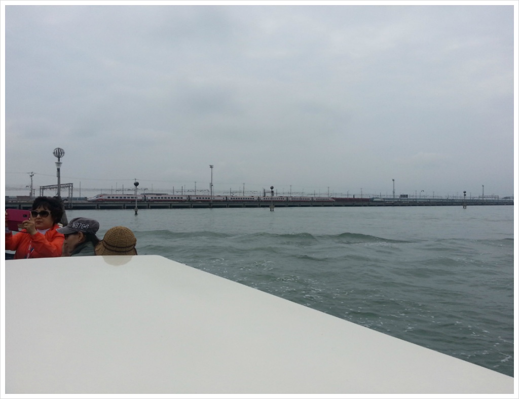 우리를 태운 수상택시는 산타루치아역을 지나 대운하가 끝나는 부분에서 유턴하여 리알토 다리 쪽으로 되돌아 왔다. 그리고 그 사이에 있는 산 제레미아 교회를 분기점으로 하는 샛길 수로를 통하여 운하를 빠져 나왔다. 수로가 교차되는 지점에는 육지 도로처럼 교통신호등도 있어 신기하였다. 운하를 빠져나오니 넓은 바다 위를 가로지르는 리베르타교가 눈앞에 나타났다. 그리고 때마침 기차가 지나가며 운치를 더해주었다. 철길 다리 밑을 지나 어느 선착장에 도착하니 오전에 배를 타고 떠났던 바로 그 여객터미널 이었다. 우리는 오후 1시 40분경에 그곳 주차장에 세워둔 버스를 타고 점심을 먹을 식당으로 이동하였다.
