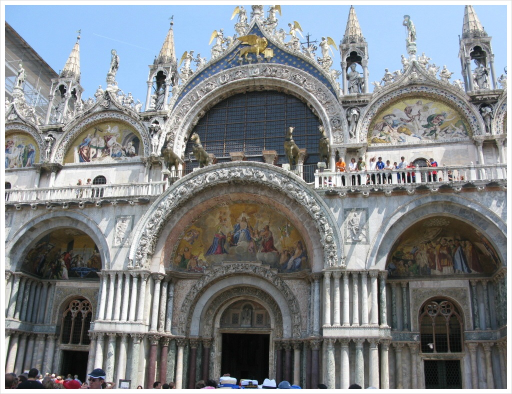이처럼 산마르코 대성당은 동서양의 건축 기법과 장식이 완벽한 조화를 이룬 최고의 건축물이며, 이야기가 있는 모자이크 벽화 및 여러 모양의 조각상이 내 외부를 장식하여 볼거리가 풍부했으나, 안타깝게도 나는 그것을 제대로 보지 못하고 시간에 쫓겨 그냥 외관만 스치듯 지나쳐버리고 말았다. 1,000년이 지난 건물이라 외관의 빛이 바래고, 부분적으로 보수공사 중이어서 그런지 멀리 보아선 내 마음을 끌만큼 그렇게 매력적이지 않았다. 아내를 챙기느라 가이드의 설명에 귀를 기울이지 못한 탓도 있었다.