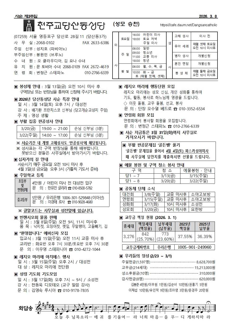 사순 제3주일 작성자이옥희 아네스|작성시간26.03.04|조회수397 목록 댓글 0 글자크기 작게가 글자크기 크게가 다음검색 현재 게시글 추가 기능 열기 북마크 공유하기 신고 센터로 신고 댓글 댓글 0 댓글쓰기 답글쓰기 댓글 리스트