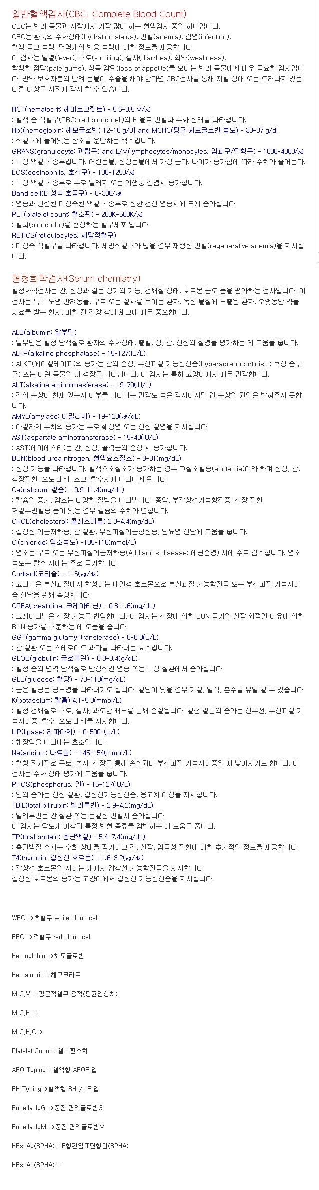 혈액 검사는 신체의 가장 기초적인 상태를 알 수 있는 기본 자료이면서도 중요한 수치를 내포하고 있습니다.