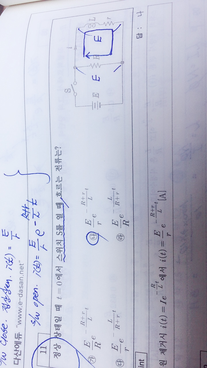 I(t)= E/r 곱하기 e -R+r/L 이라고 하셧는데요 스위치 오픈시에요... 지수함수 위에 R+r은 여기선 왜 둘이 더해줫을가요..?ㅜ