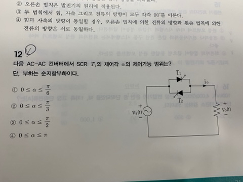 13년 국가직 기기 12번 작성자whale|작성시간21.03.05|조회수230 목록 댓글 2 글자크기 작게가 글자크기 크게가 위상제아 제어가능 범위 관련입니다근데 해설지는 등호 표시가 같다는것도 써있는데 해설 강의 판서에선 같다는 표시가 없어서 뭐가 정확히 맞는건지 모르겠어서 질문드립니다 다음검색 현재 게시글 추가 기능 열기 북마크 공유하기 신고 센터로 신고 댓글 댓글 2 댓글쓰기 답글쓰기 댓글 리스트 작성자시나브로 | 작성시간 21.03.05 해당문제에서 등호가 크다 또는 크거나 같다라는 의미는 큰 의미가 없습니다.해당 범위에서 제어가 가능하다라는 것이 의미가 있습니다.정현파에서 부하각이 0도일 때에는 전압, 전류도 0이기때문에 SCR에 신호를 주어도 도통되지는 않습니다. 답댓글 작성자whale 작성자 본인 여부 작성자 | 작성시간 21.03.07 감사합니다 댓글 전체보기