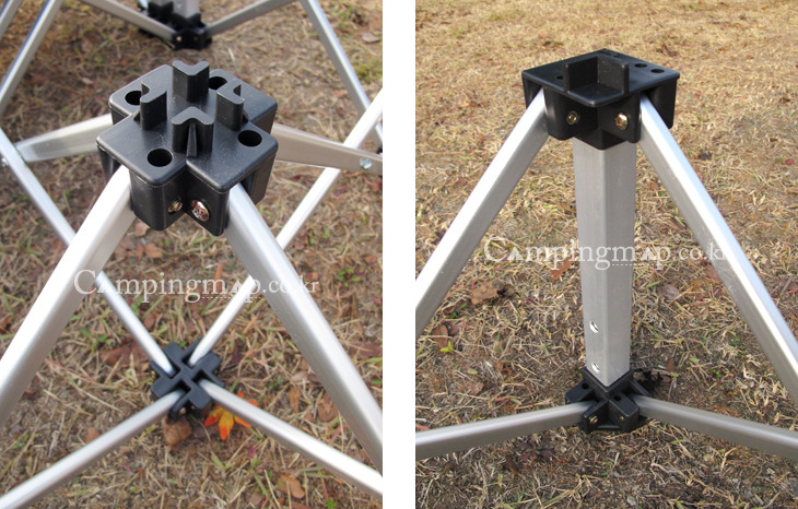 혼자서 설치해야 할 경우 지주팩을 박고 한쪽 모서리를 걸치고 프레임을 잡아 당기면 됩니다.