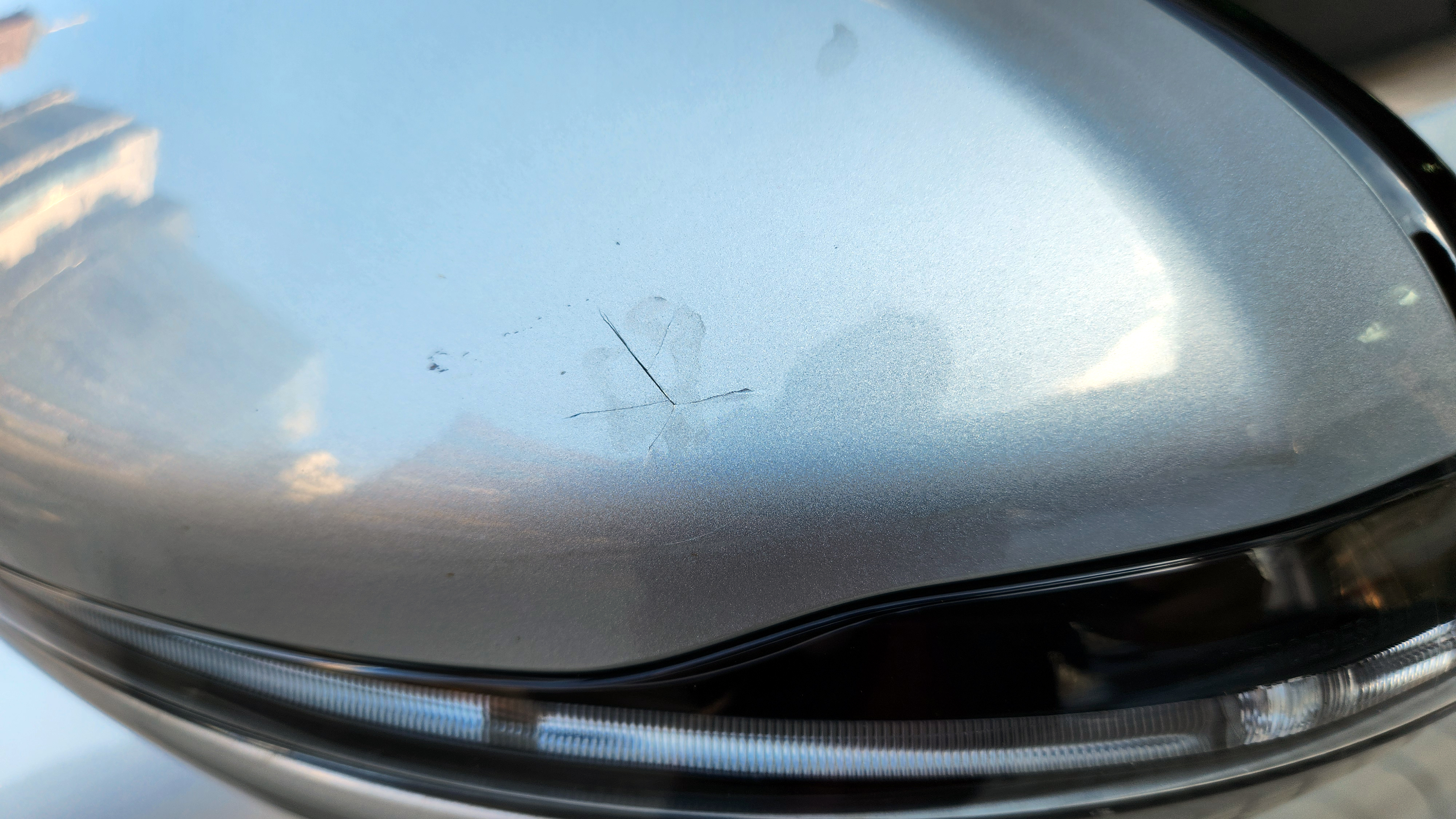 사진에 보이듯이 커버가 충격으로 깨진 모습입니다. 이런 손상은 교환하지 않고 복원 가능하구요.